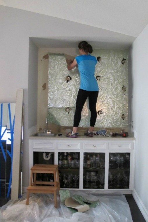 Once the wallpaper was gone  (I totally kept some of the larger, intact pieces to use for art somewhere), the wet-bar looked like this…