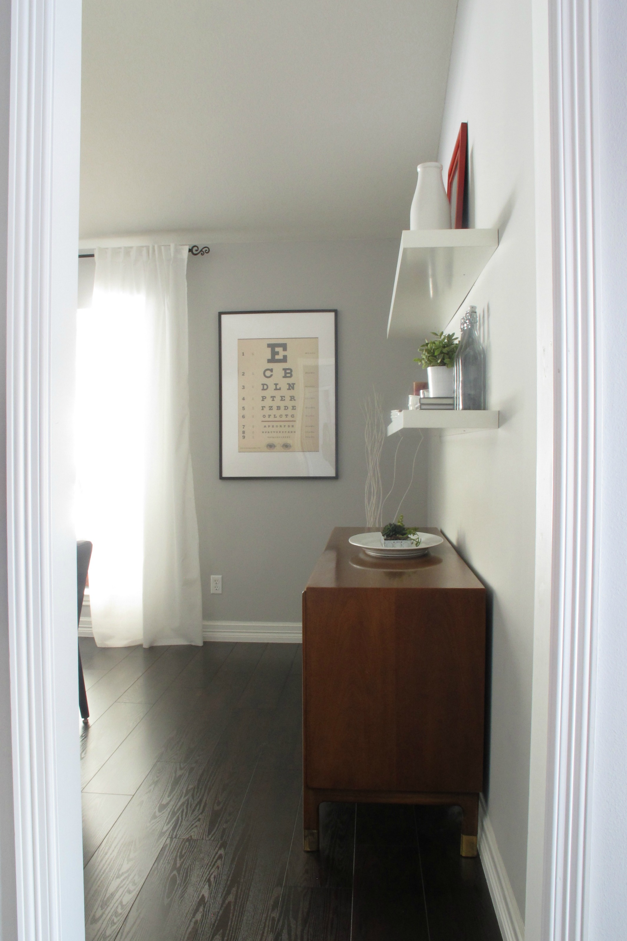 The print goes swimmingly in the space. Size-wise, it’s the cat’s meow. And stylistically, it’s the perfect compliment to the more organic, colorful painting on the opposite wall. It has complimentary colors, but it doesn’t compete thanks to it’s more neutral palette. Plus, it’s the first thing you see when you walk from the kitchen to the dining room…