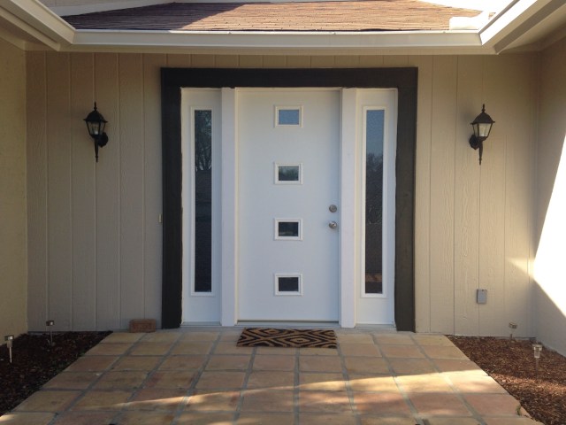 This shot was taken as I started painting the wood trim. The trim is staying and is untreated wood, so I needed to paint it to shield it from the elements. I refuse to paint the sidelights until the permanent door is installed since I know the paint job will most likely be ruined during install. So, in the meantime, our door looks like this…