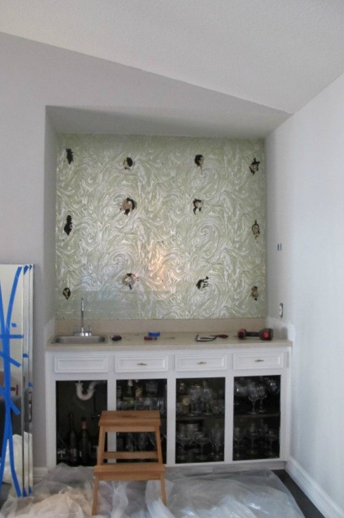 Remember that wallpaper that we found behind our wet-bar mirror??  And instead of peach walls (like in the bathroom), they had peach countertops!  Way to tie it all together.  This house must’ve been the place to boogie in its heyday.  😉