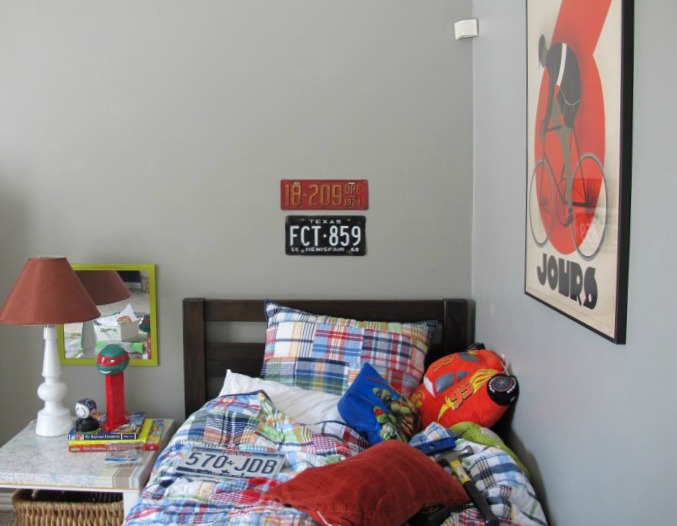 So anyways, after three days of dramatic clock banter, inspiration finally hit. I knew that I wanted to do something with the license plates that hung in his last bedroom (plus, I have a about 20 more now than I did then). And although I ultimately want to create a giant statement wall with these license plates, I decided to hang the clock within a smaller grouping of plates for the time being to appease the child and then slowly add more license plates as I decided on how to execute my statement wall.