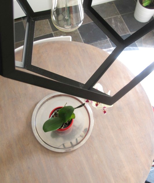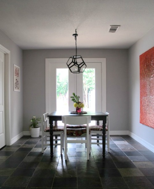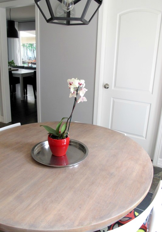 I can’t even tell you the difference the round table makes in the space.  The flow is so much better.  Plus, the table is way pretty.  The camera doesn’t really capture the texture as it is in person. I’m really happy with how it turned out.  As mentioned before, the bird chairs have got.to.go.   Like, way gone. They’re fine in general, but they just don’t compliment the finish of the table at all.  I may recover the seats with some leftover fabric that I have on hand just to tide me over until we buy my dream chairs.   We’ll see.