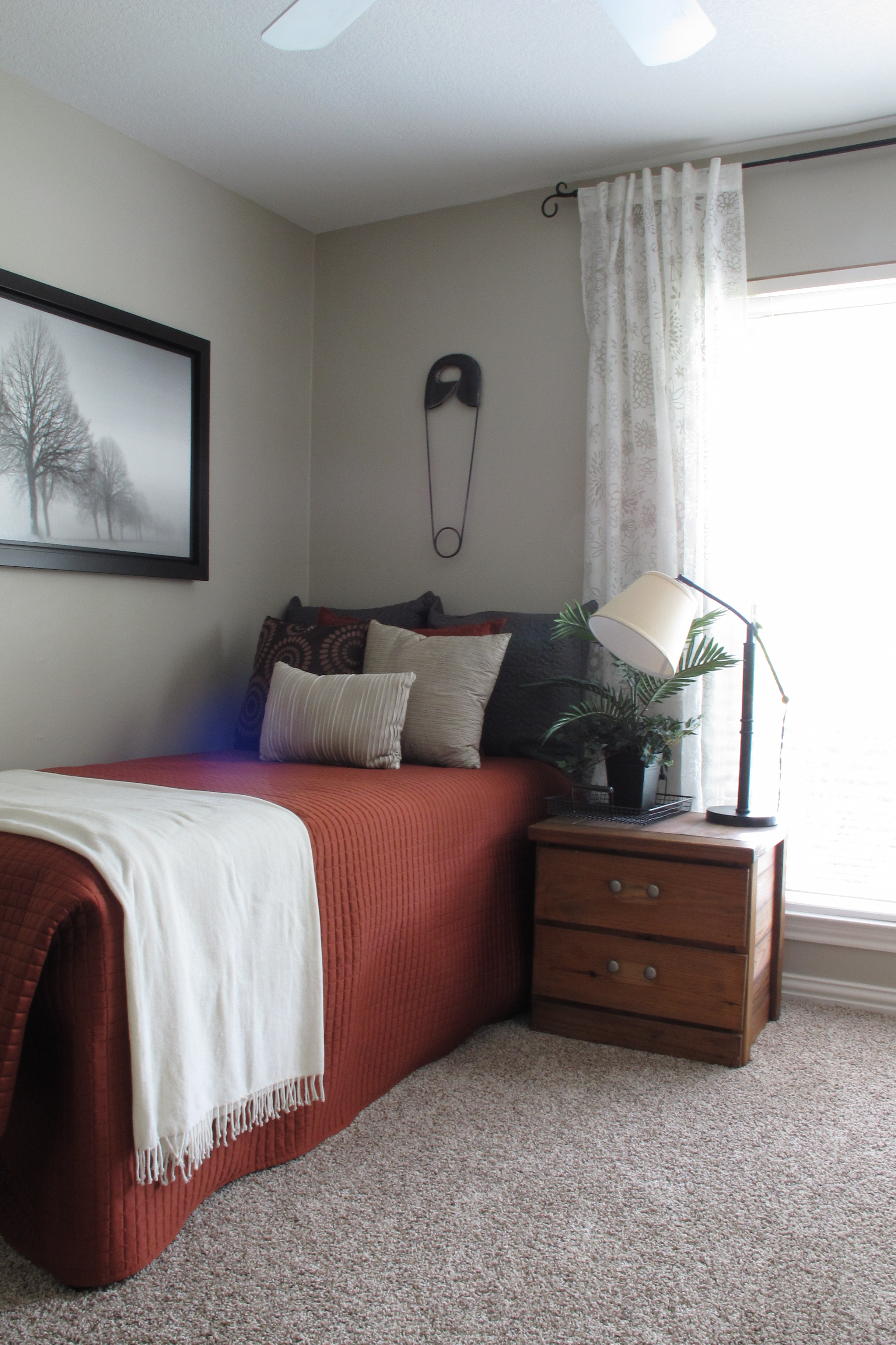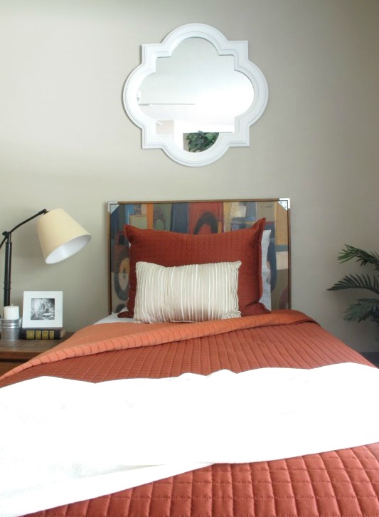 This room is a work in progress, but is definitely getting closer.   I anticipate at least 10 more changes before I call her done.  Lol!   My main issue with the space right now is the bedding.  That’s a queen sized bedspread that I’m making do on a twin sized bed.   I’m totally working with what I have right now. The bedskirt is just scrap canvas material that I had on hand.  I need to iron it which will make it look more tailored for sure. Our hold-up on purchasing new bedding is that we either want to upgrade to a larger bed at some point or change the function of the room entirely (since we also have the hang-out room with a queen sized pull-out sofa to sleep guests).  So, we’re trying to make this room presentable on a shoestring budget until we figure it out.   Eventually, we’ll have legit bedding.  I’m almost sure of it! Haha!  I also have a fun nightstand project up my sleeve that I can’t wait to get started on.  It’ll help the nightstand fit in more with the style of the space, appear less visually heavy, and be at a better scale with the bed.