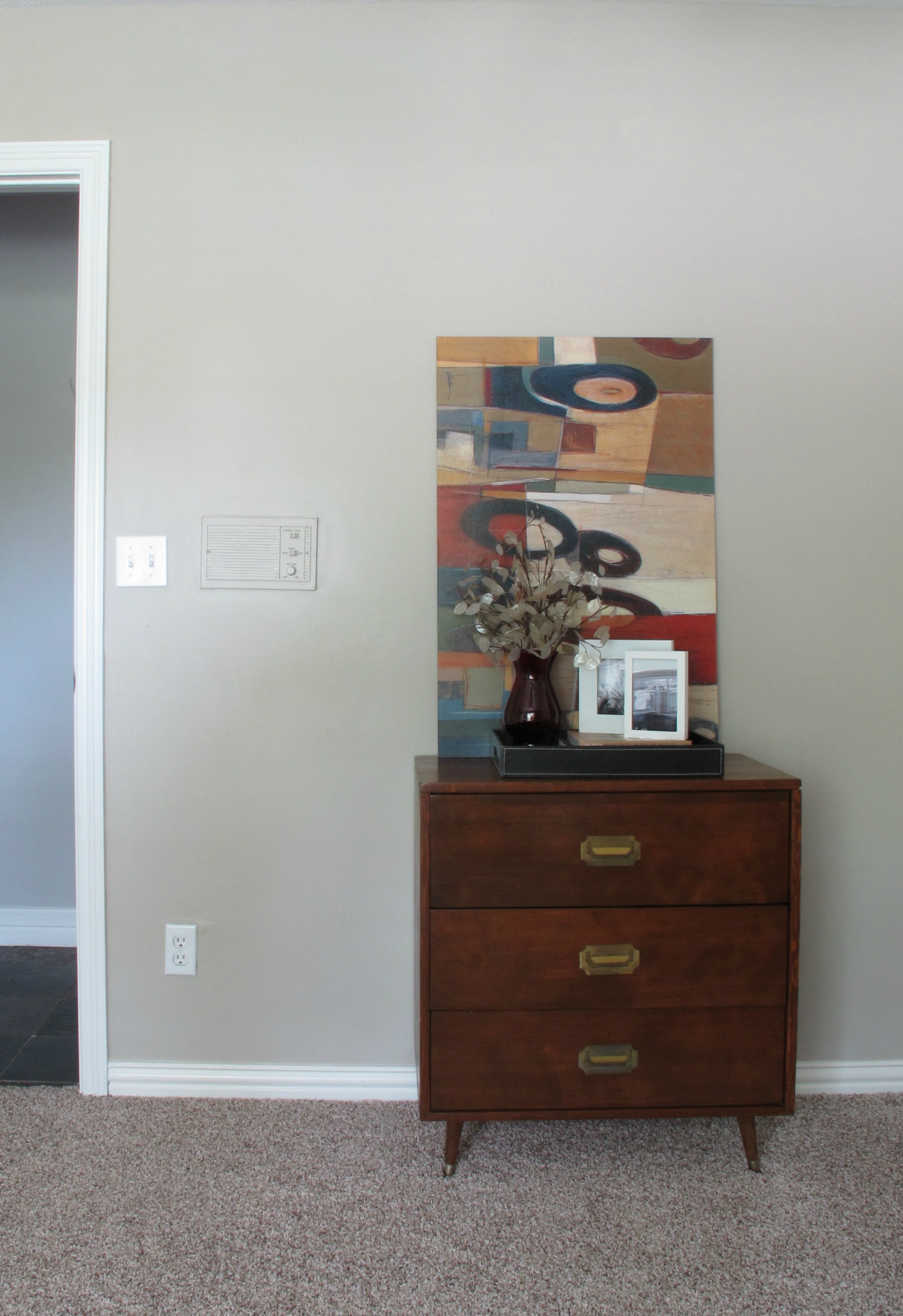 ***For updated pics of this space, check out this (revamping a mid-century nightstand), this (adding a new awesome $12 lamp) and this (creating DIY burlap wall art).***