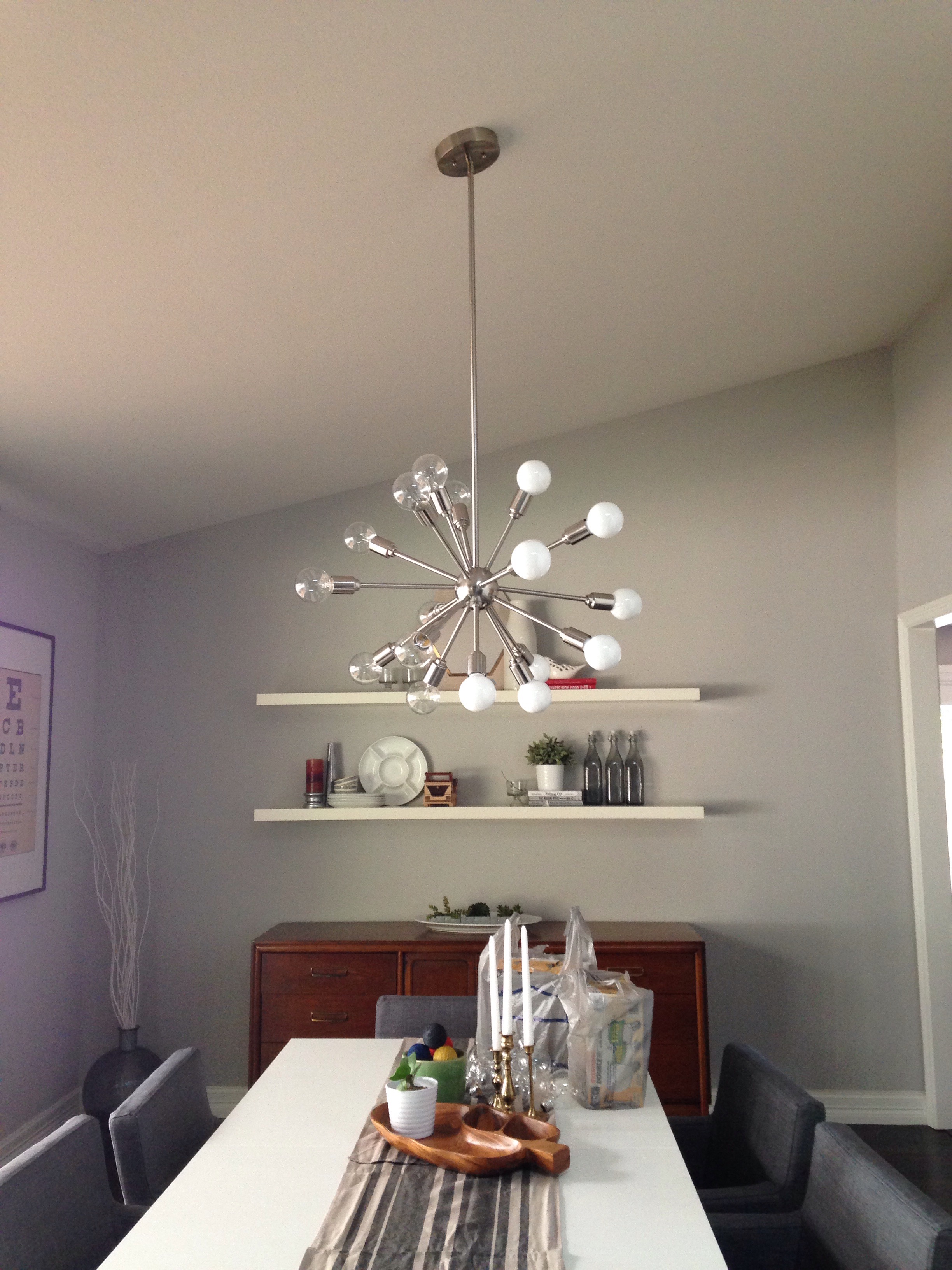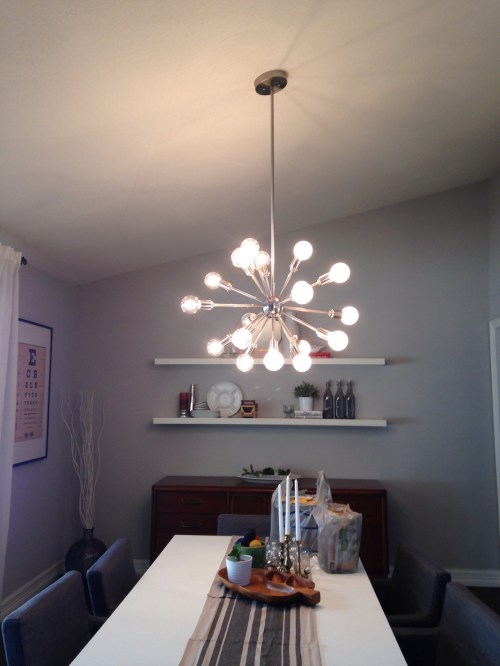 After we installed the chandelier, we screwed in the Edison bulbs that came with it and turned it on. And BOY… were we blinded by the light. Literally. And we were hot. And not in a good way. Lemme tell ya, EIGHTEEN 60-watt bulbs within close proximity feels a bit like being a hair to close to the sun. That was a TON of wattage to be just mere feet away. We quickly realized that there was no way we’d be able to host comfortable dinner parties with the current bulbs installed. NO WAY.