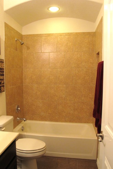 After: Guest bath, other view (Here, we installed a wire basket, removed the side-splash and added some personal artwork.)…