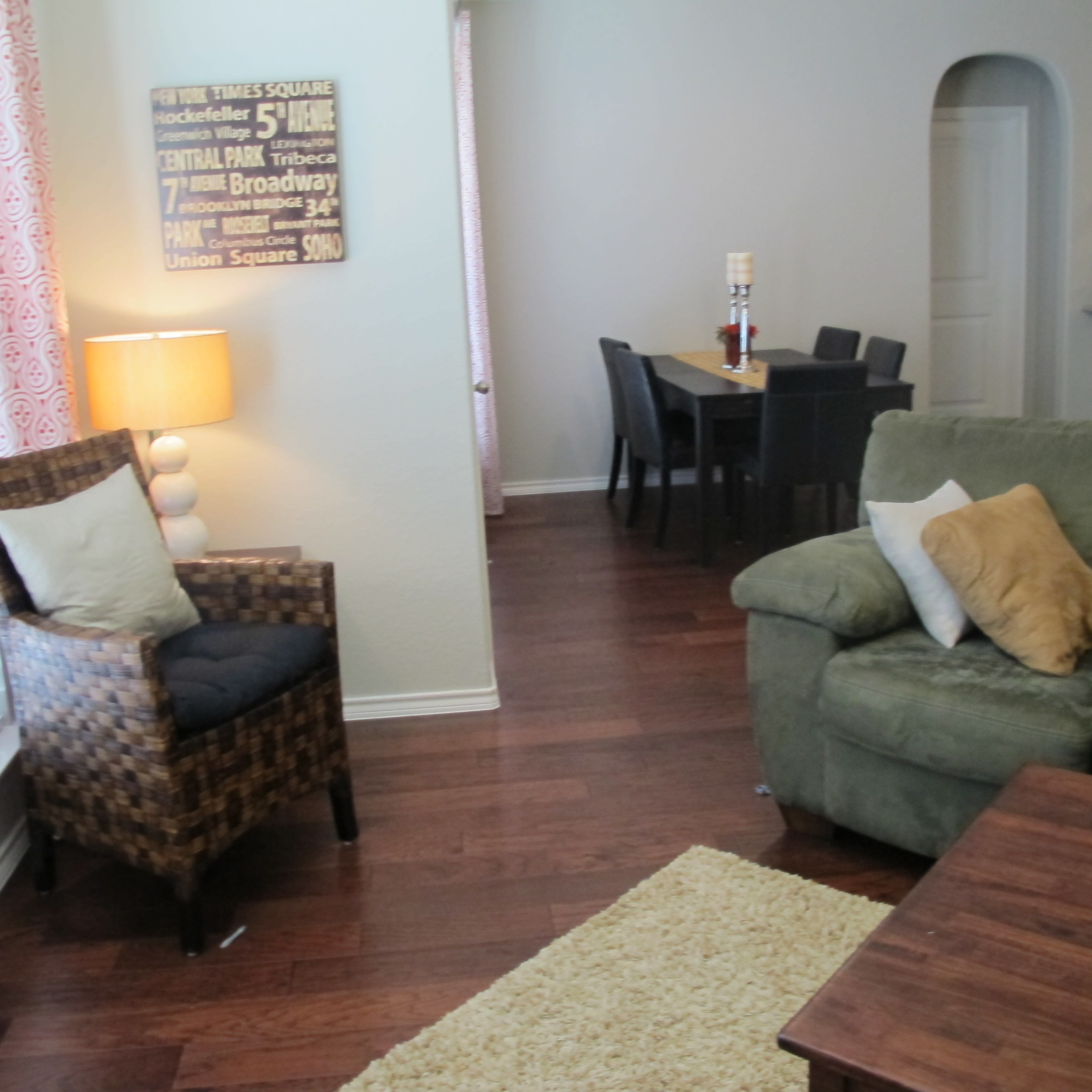 Of note: The entire house was beige when we moved in.  Before the 6 week pics were taken, we’d already painted the foyer, hallway, living room, breakfast nook and kitchen a light grey called Dolphin Fin by Behr.  We’d also painted the laundry room with a nice, blue-grey oops paint.