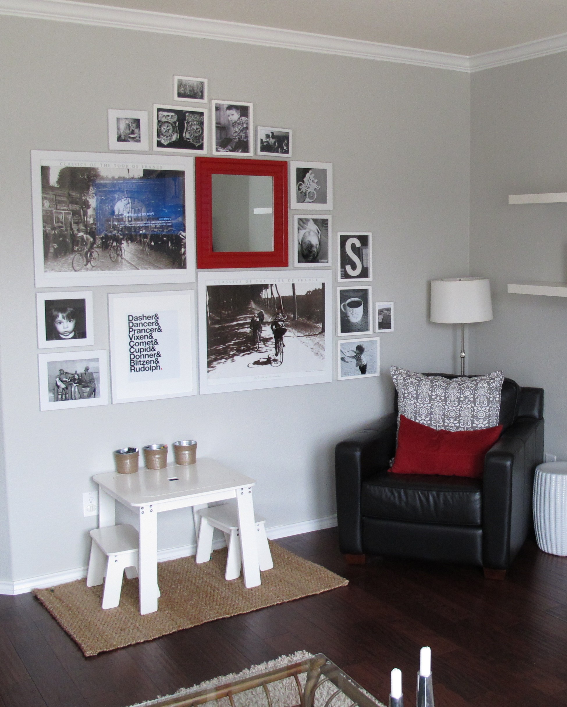 After: Living room from sofa (The main addition to this wall is the assymetrical frame wall.   You can find a tutorial on how this came to be in this post) …