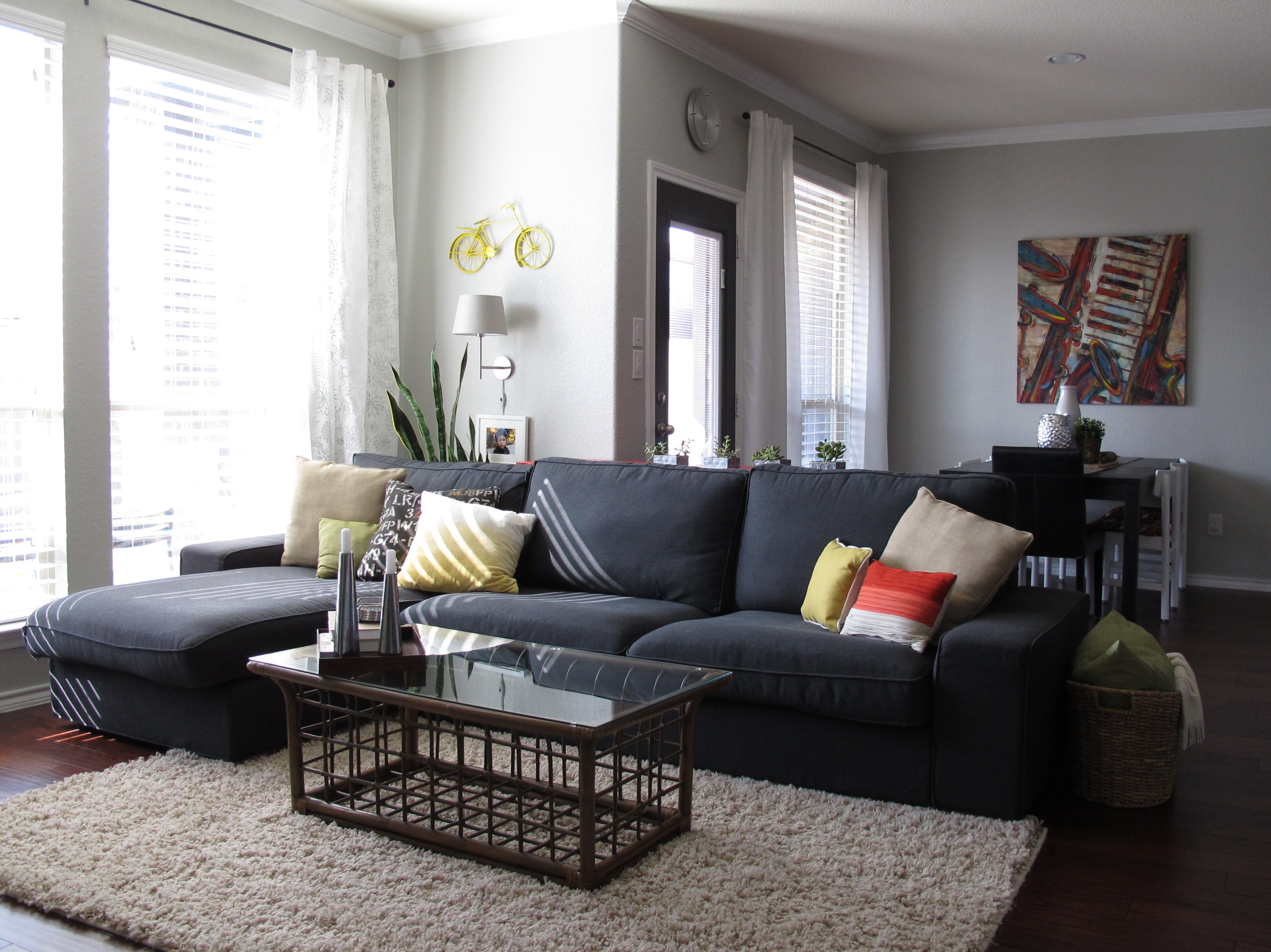 After: Living room from hallway (Once we finally figured out a good layout for the space, we purchased a vintage coffee table off craigslist, painted the door a crisp charcoal, DIY’d some industrial succulent planters, and stained some basket cases to complete the look of this space.) …