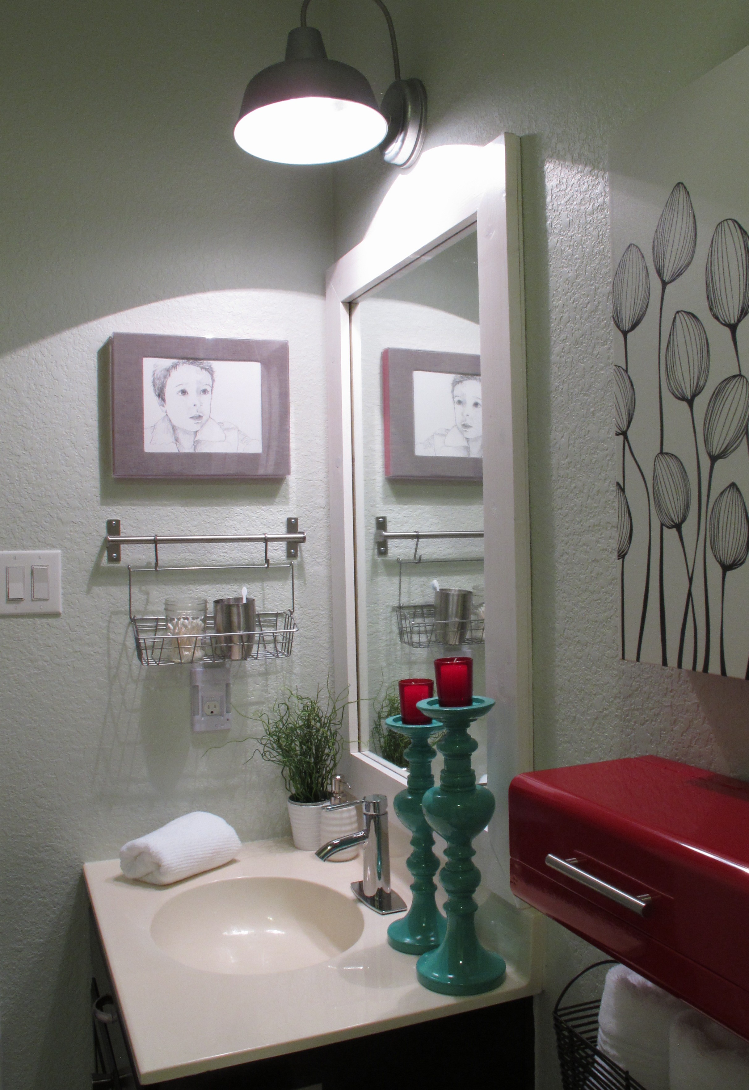 After: Guest bath (we replaced our lighting fixture, framed and white-washed our mirror, painted the room a soft aqua, converted a thrift store bread-box into toilet paper storage, and changed out the art above the toilet.)…