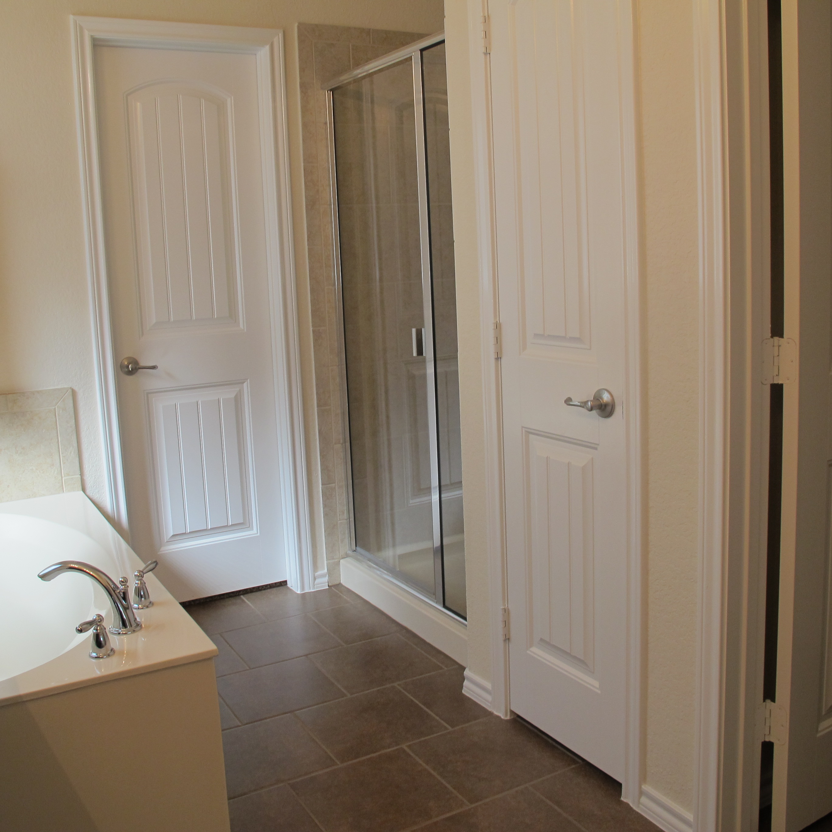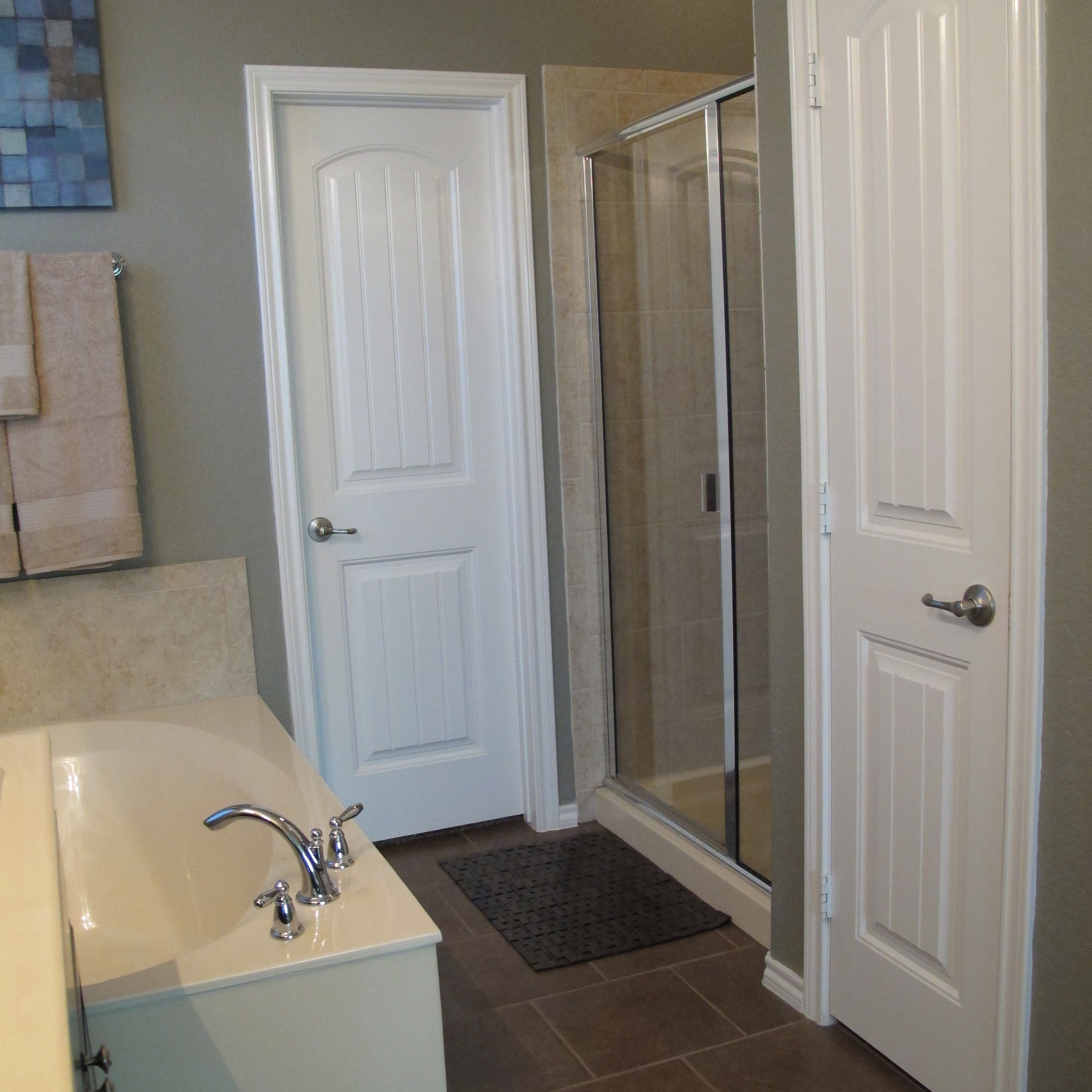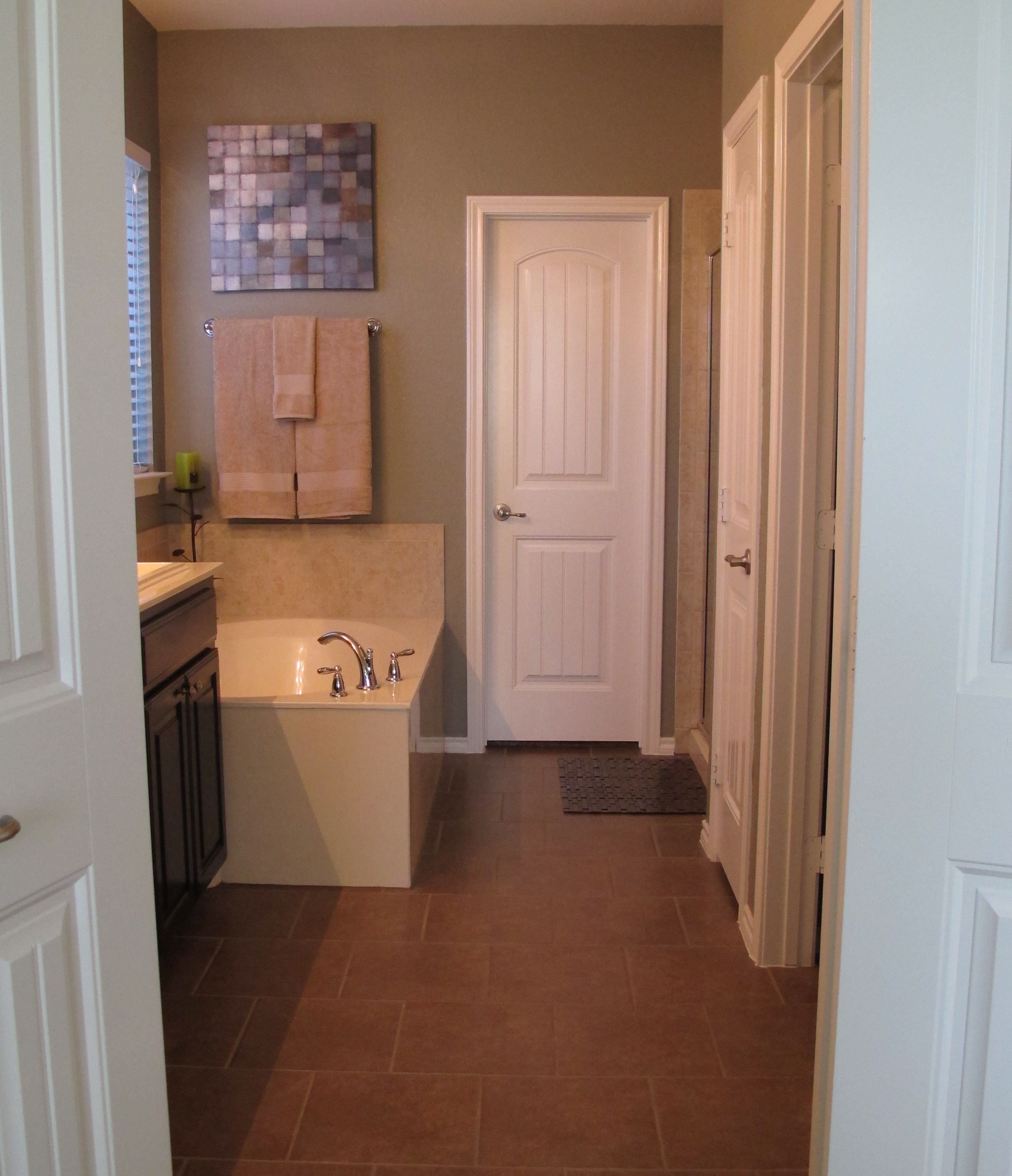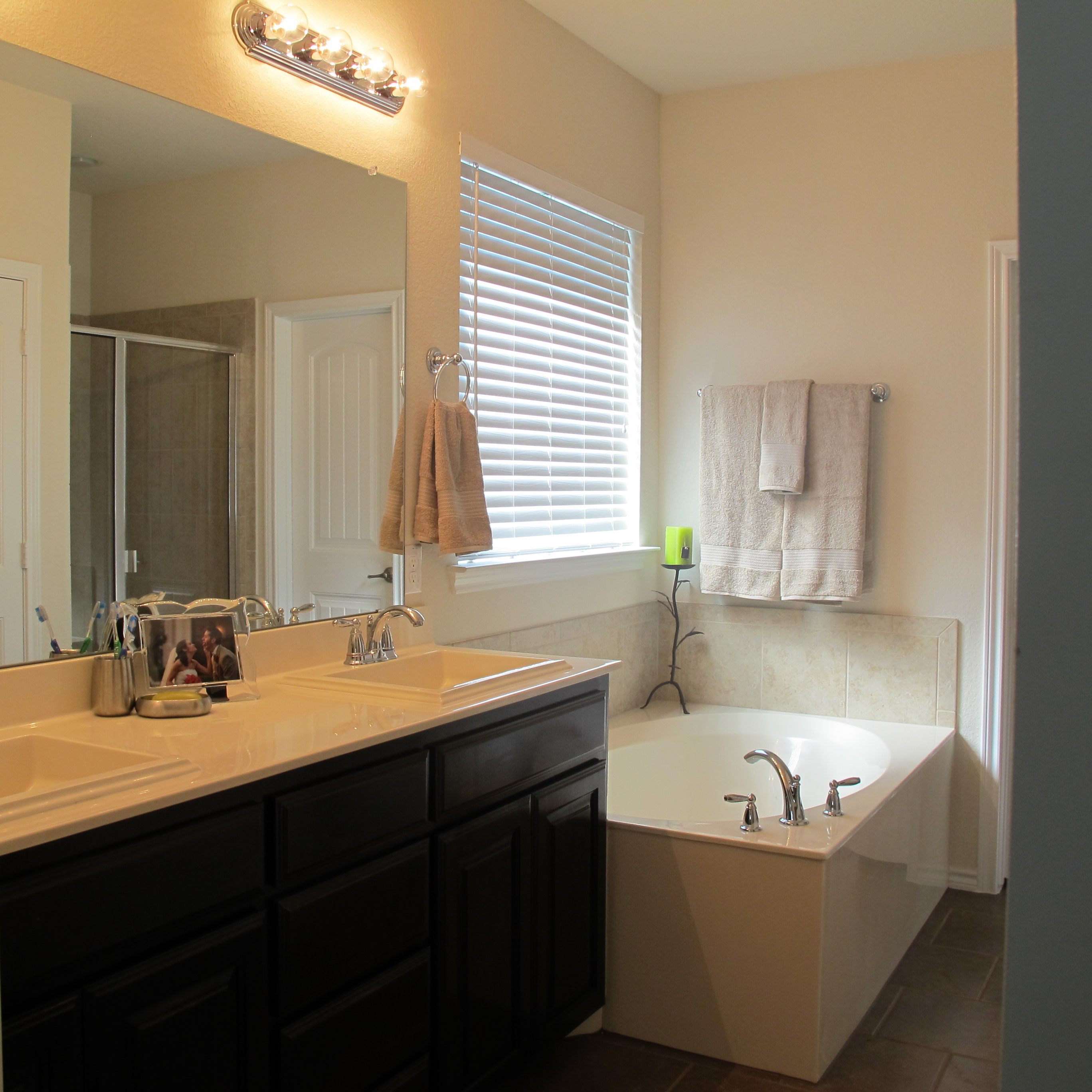After: Master bath (We painted the walls Driftwood Grey by Glidden and accessorized.)…
