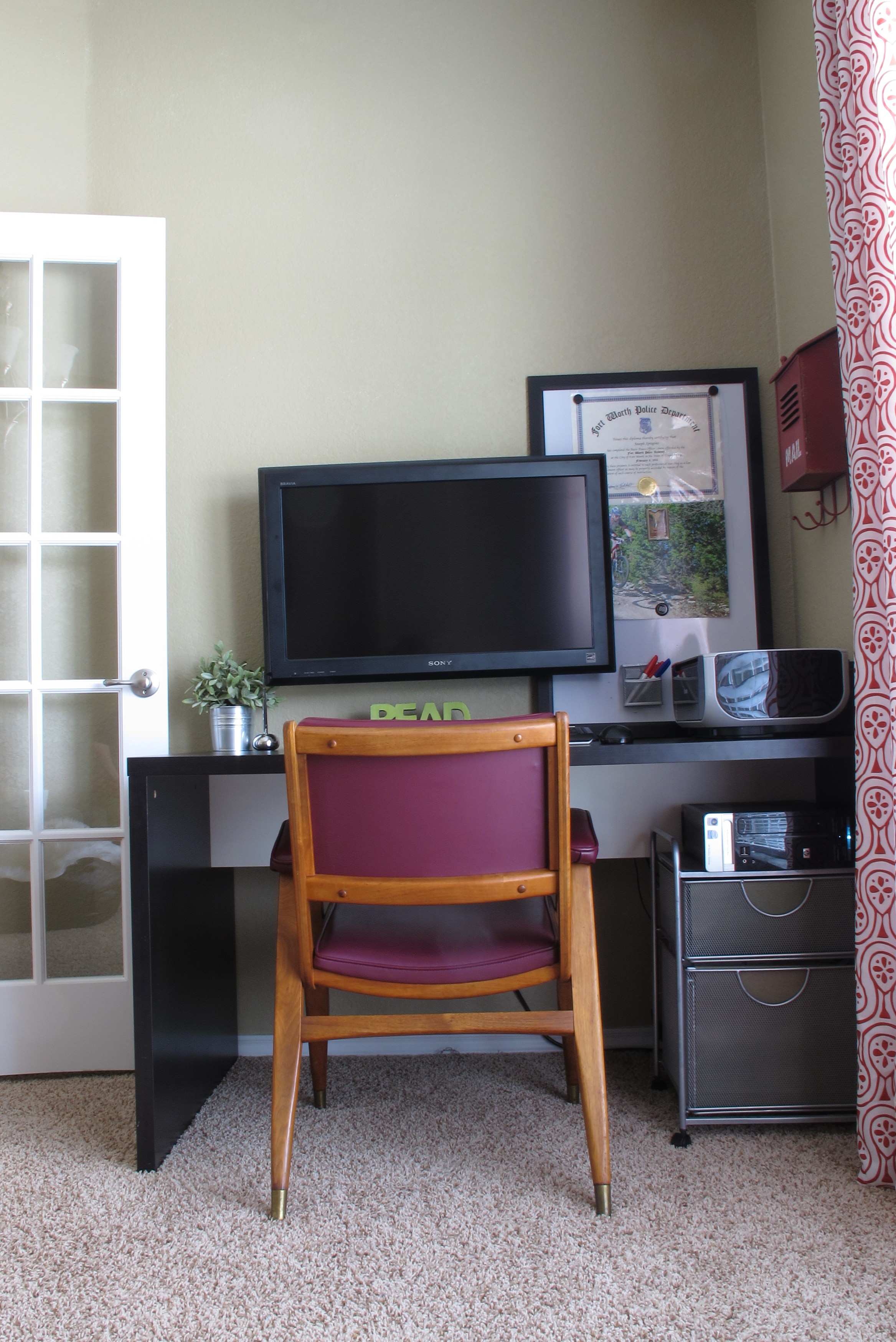 After:  Front room, the other side (We started by flipping the layout when we acquired our Friheten Sofa.   With the desk on this wall, we incorporated my beloved mid-century desk chair and mounted our upgraded screen to the wall for increased flexibility.)…
