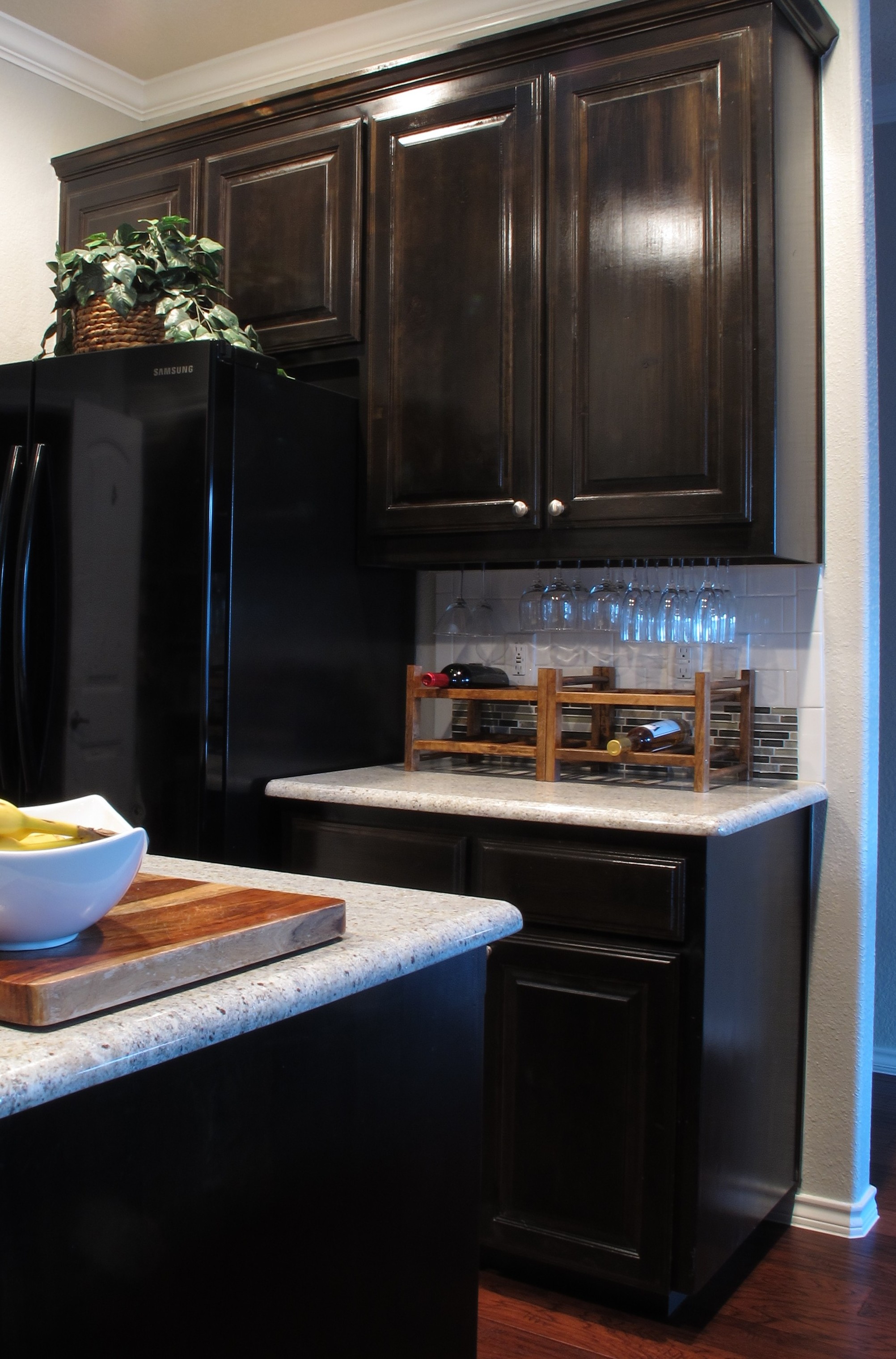 After: Kitchen (Aside from accesorizing, not alot changed in the kitchen except for a DIY wine nook that we added next to the refrigerator (second pic below).) …