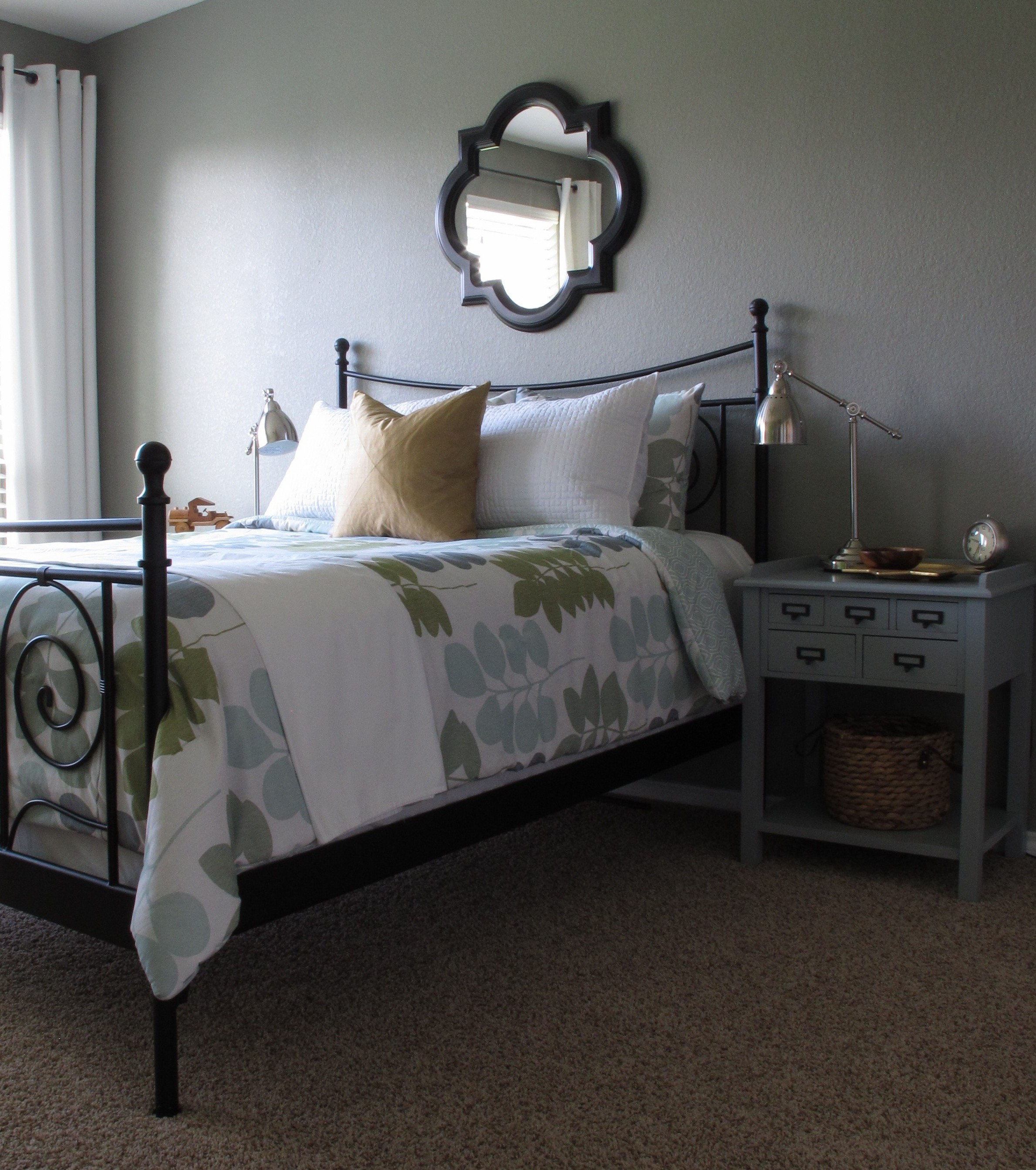 After: Our Master (We painted the walls Driftwood Grey by Glidden, added a quadrefoil mirror, some curtains, a pair of grown up nightstands and a DIY Target-inspired bench (second pic below))…