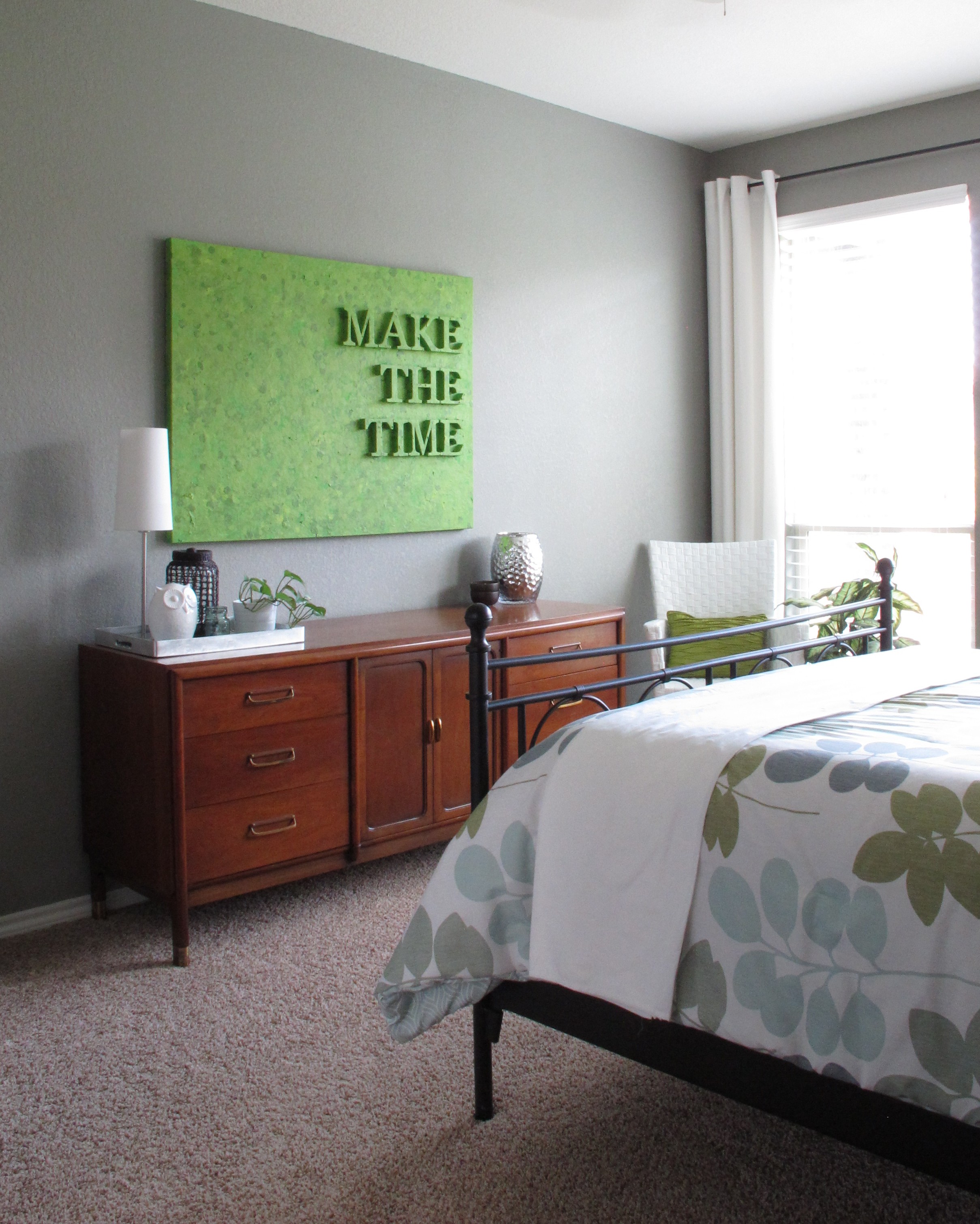After: Master bedroom, the other view (We replaced the tall-boy with a low mid-century dresser, added some large-scale art, and painted the dated wicker chair in the corner for a fresh, open look.)…