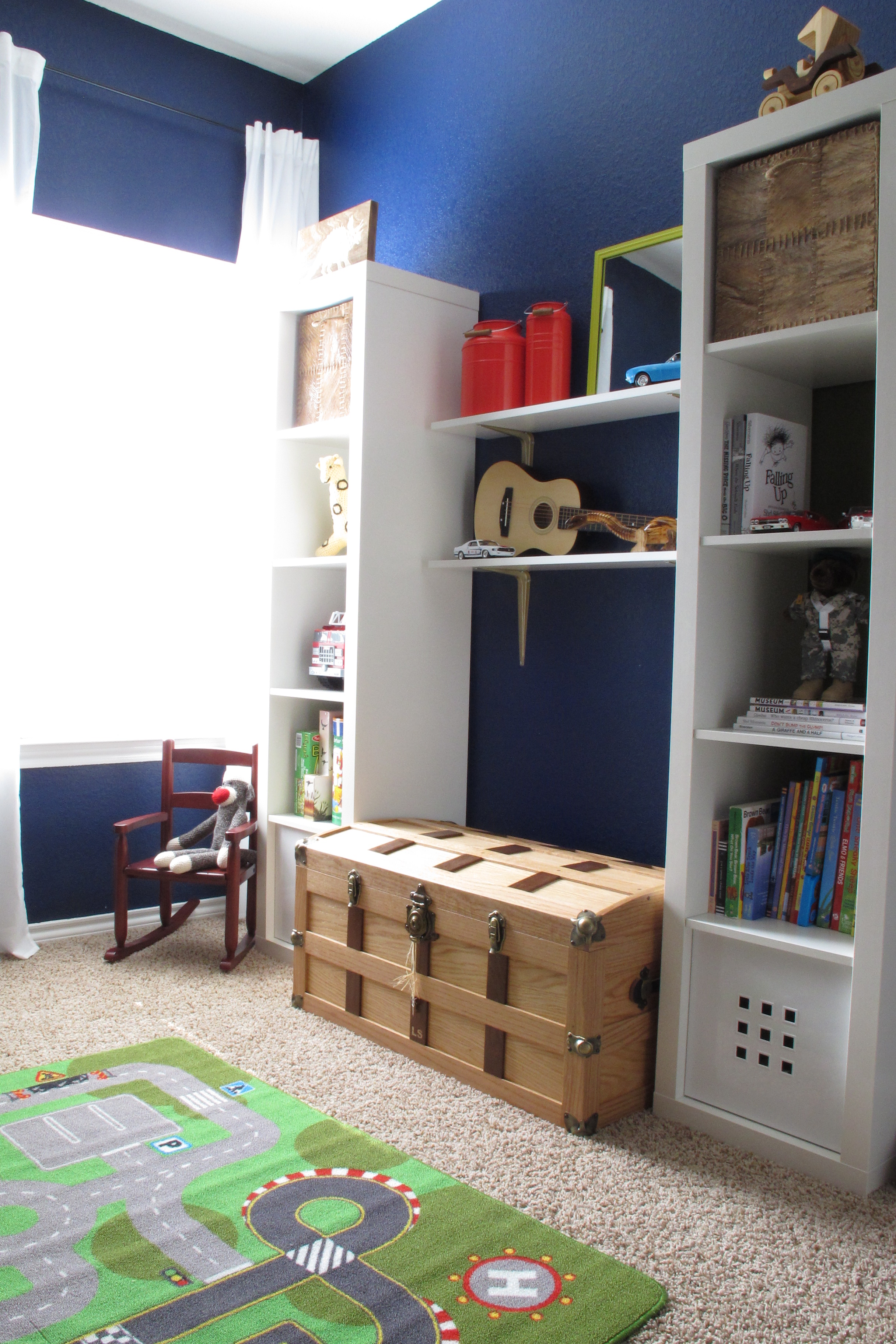 After:  Lucas’s room (We painted the walls a rich navy tone, rearranged the space so that it flows much better, added a DIY map side table, some memorable Rubicks cube art, curtains and accessories.)…