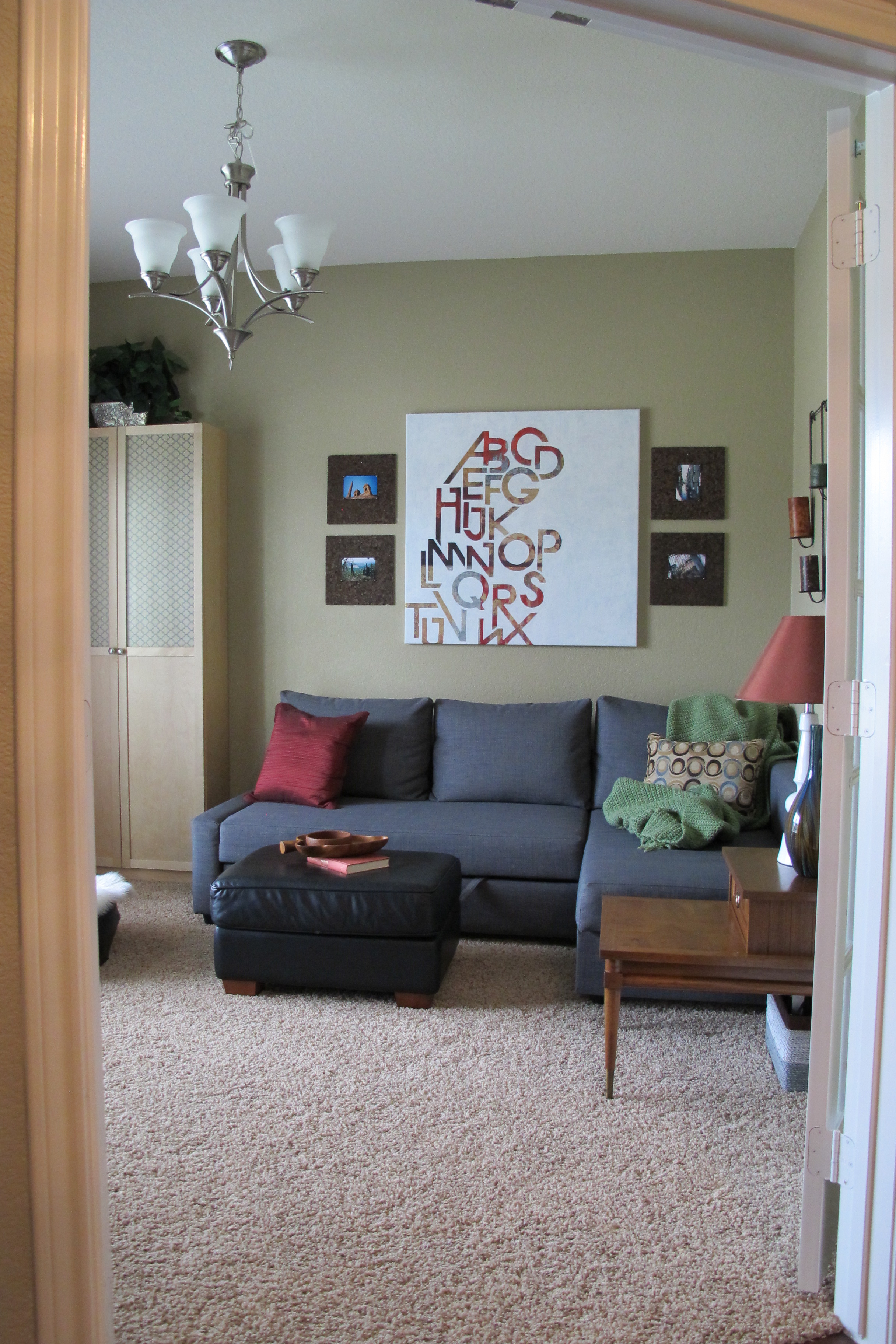 After:  Our front room (First, we focused on function by transforming it into a tri-functional room. We painted the room a soothing taupe tone, performed an easy Ikea hack on the large cabinet, DIY’d alphabet art out of an old canvas, and restored a vintage table using mayonnaise.)   …