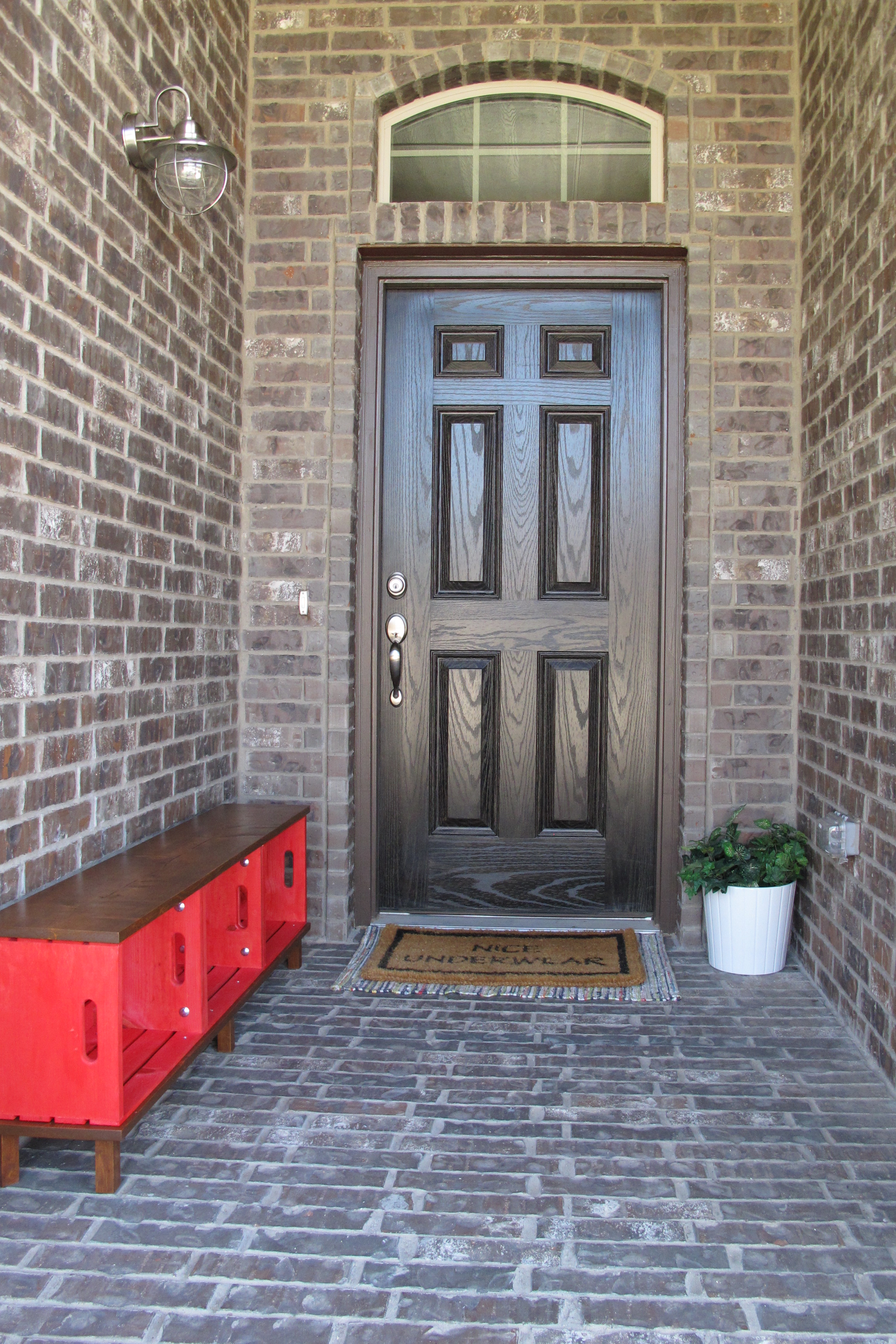 After: Front porch (We changed out the light fixture, created a DIY crate bench, and procured the doormat of my dreams. )…