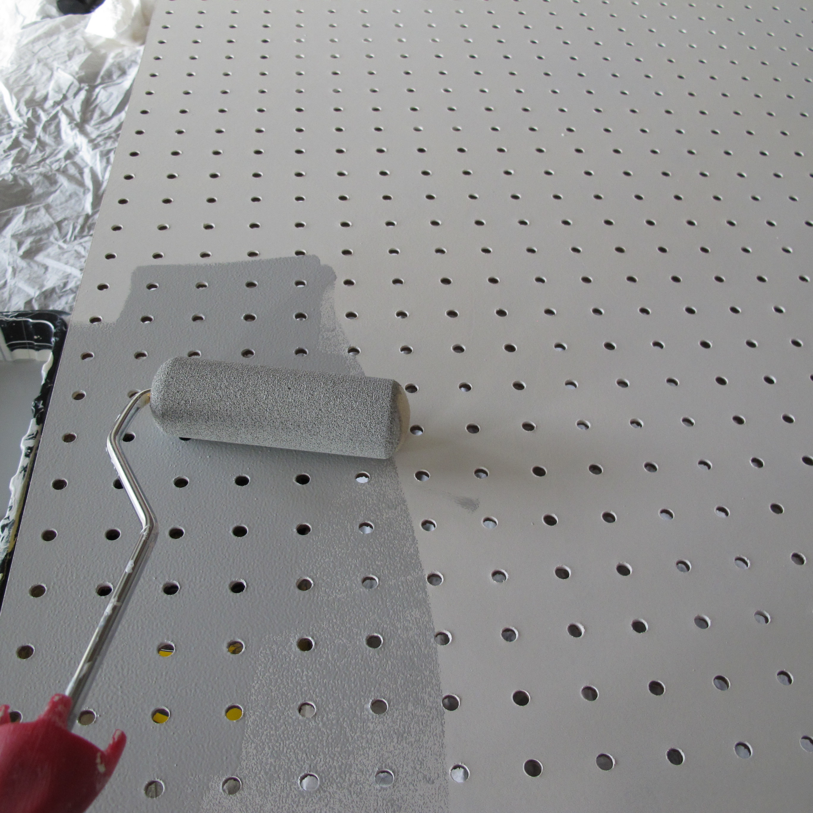 You simply rub it on with a lint-free cloth and it, well, deglosses the surface so that paint can more easily adhere. It’s basically liquid sandpaper. Once dry, I applied a coat of shellac-based primer since I wasn’t sure what would work best on the pegboard. Shellac-based primer entered my life here and I fell in love. It’s a bit more expensive than other primers and pretty stinky but it works in situations where other primers may not. During my various Pinterest adventures, I’d read a few pegboard painting tutorials where the main complaint was that paint didn’t easily adhere to pegboard and would soon chip off. So, I decided to err on the side of caution and go for the big guns. I applied my primer coat with a small foam roller in the garage with the door open for ventilation.