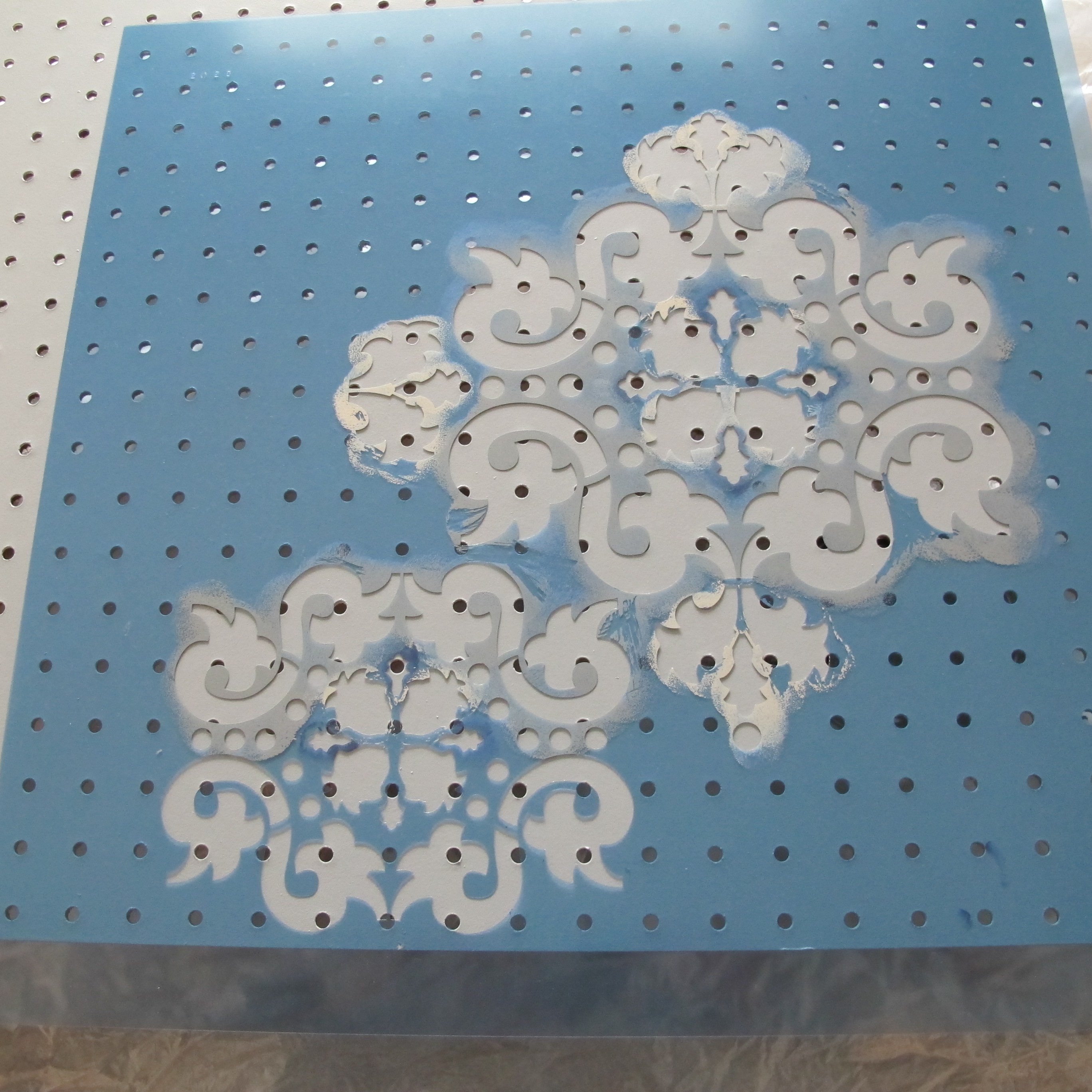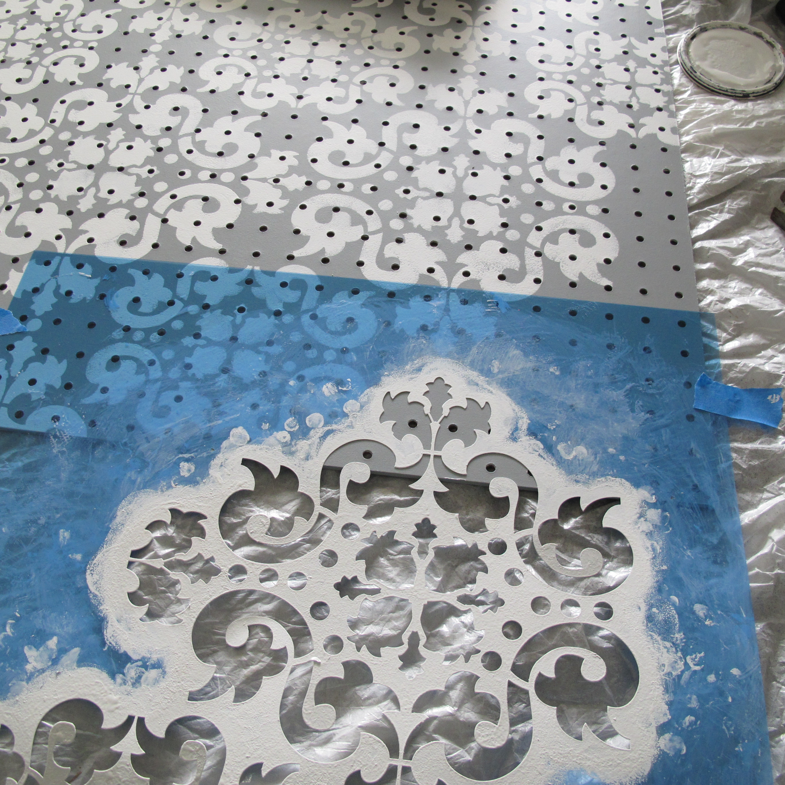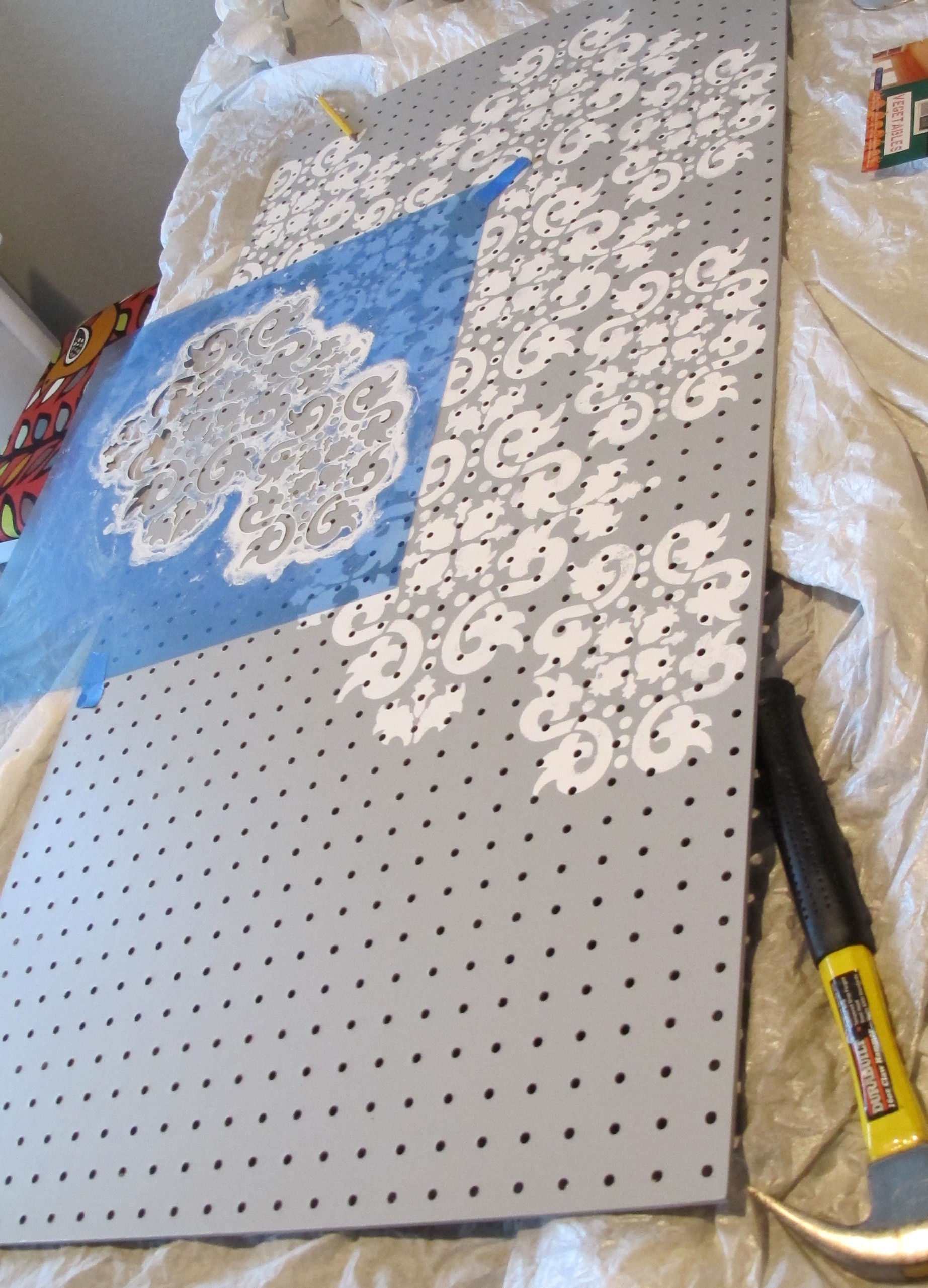 I started by lining up my stencil so that it was straight. This was pretty easy since I could just line up the little triangle indicators (not shown, but they’re obvious when you look at the stencil close-up) on the stencil to the pegboard holes.