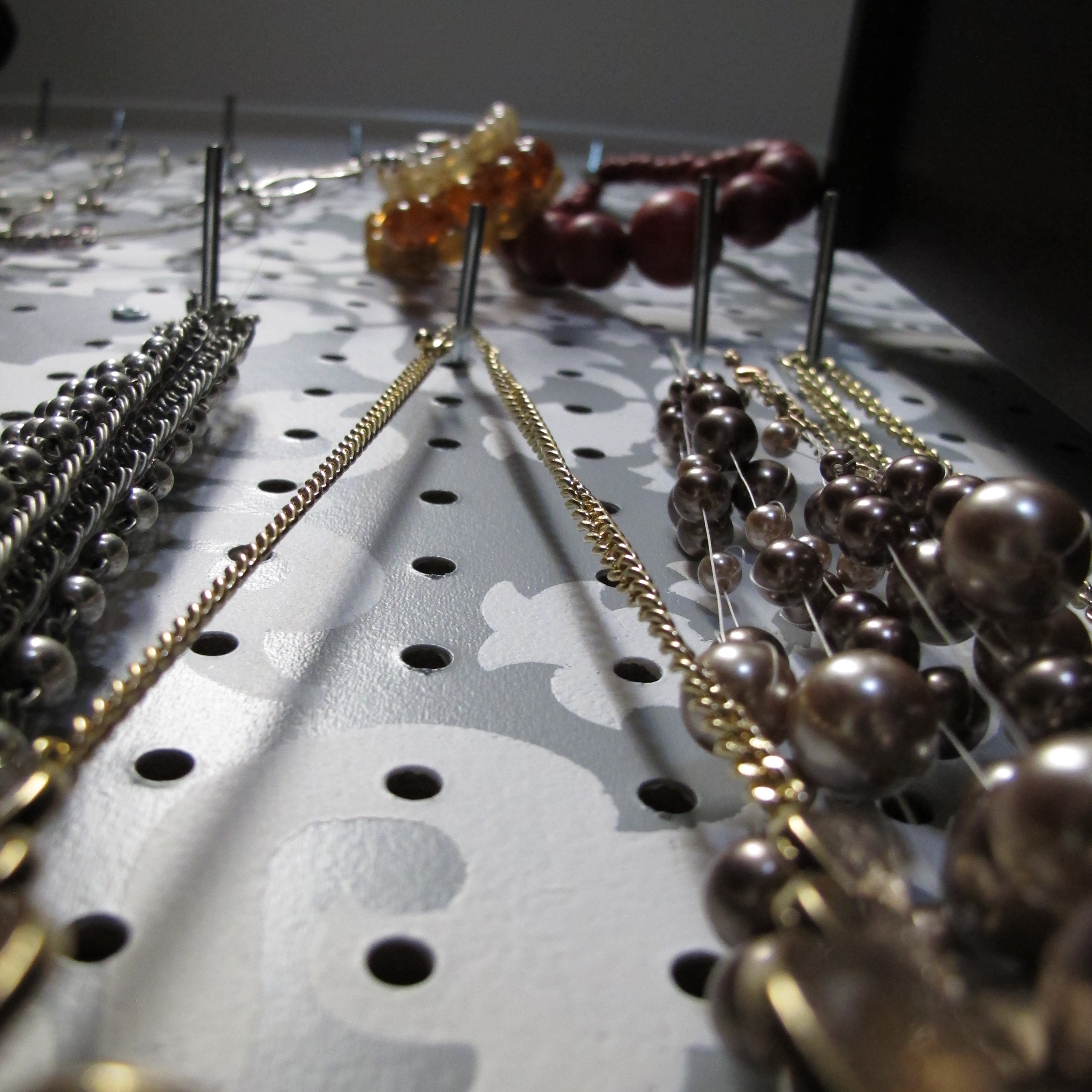 I decided that I wanted something just as functional, but better looking (which didn’t result in 30 more holes in the wall). So, I went to Home Depot and picked up a piece of pegboard for $8.96 along with some small hooks for around 3 bucks. I figured that I’d paint the pegboard to make it more attractive and hang it behind my jewelry box.