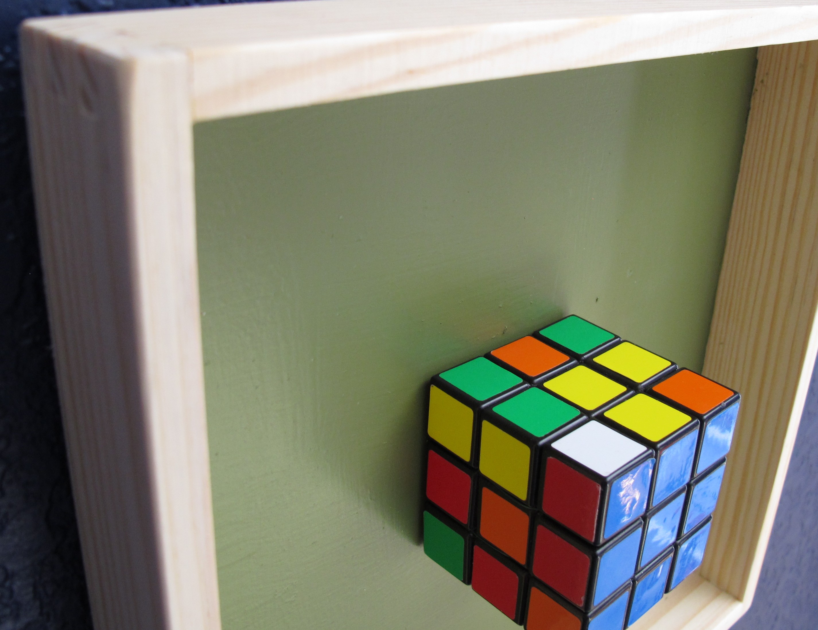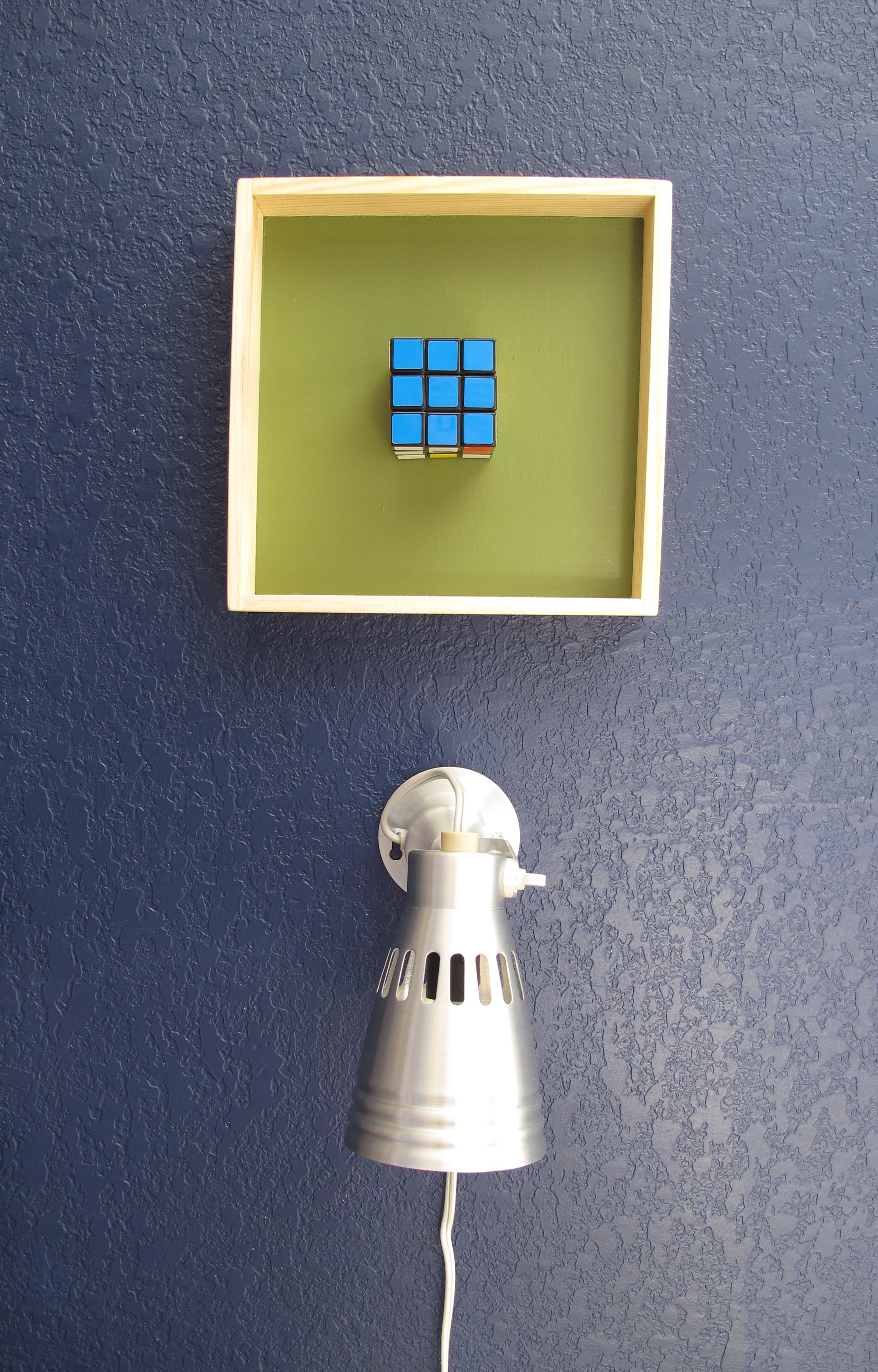 I didn’t want to glue it or do anything that might ruin the rubiks cube in case I ever wanted to change it. I figured that Alex would be proud of the blue side that he’d completed, so I kept that side in front. And I hung it in Lucas’s room…