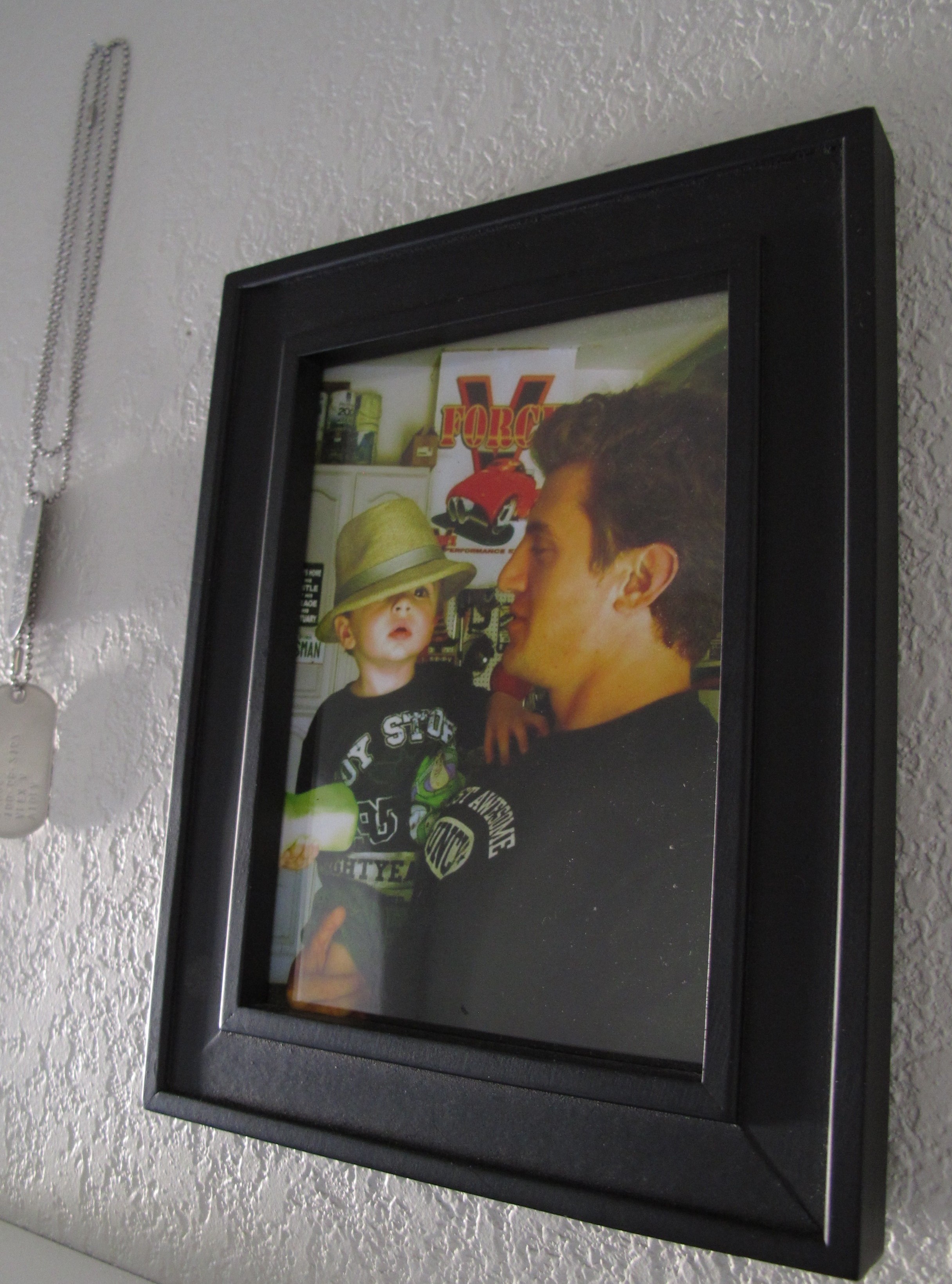 I took it in my parents garage in the summer of 2012. It’s my favorite picture of the two of them. It’s the exact copy that I framed and gave to Alex for Christmas that year. It was returned to us after we lost him. I couldn’t bear to change the frame for this reason. So, I took it as is and hung it on our hallway collage wall…