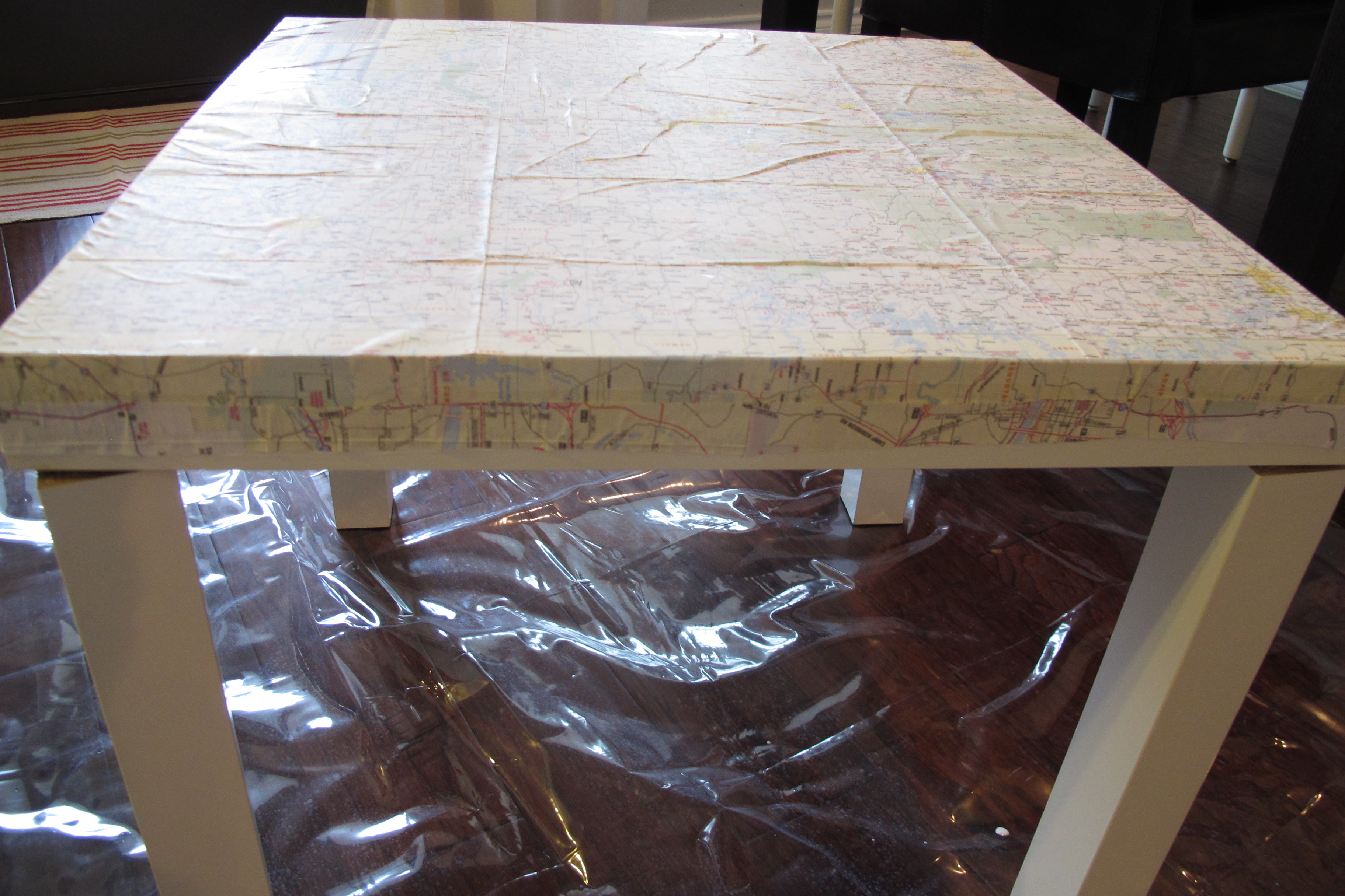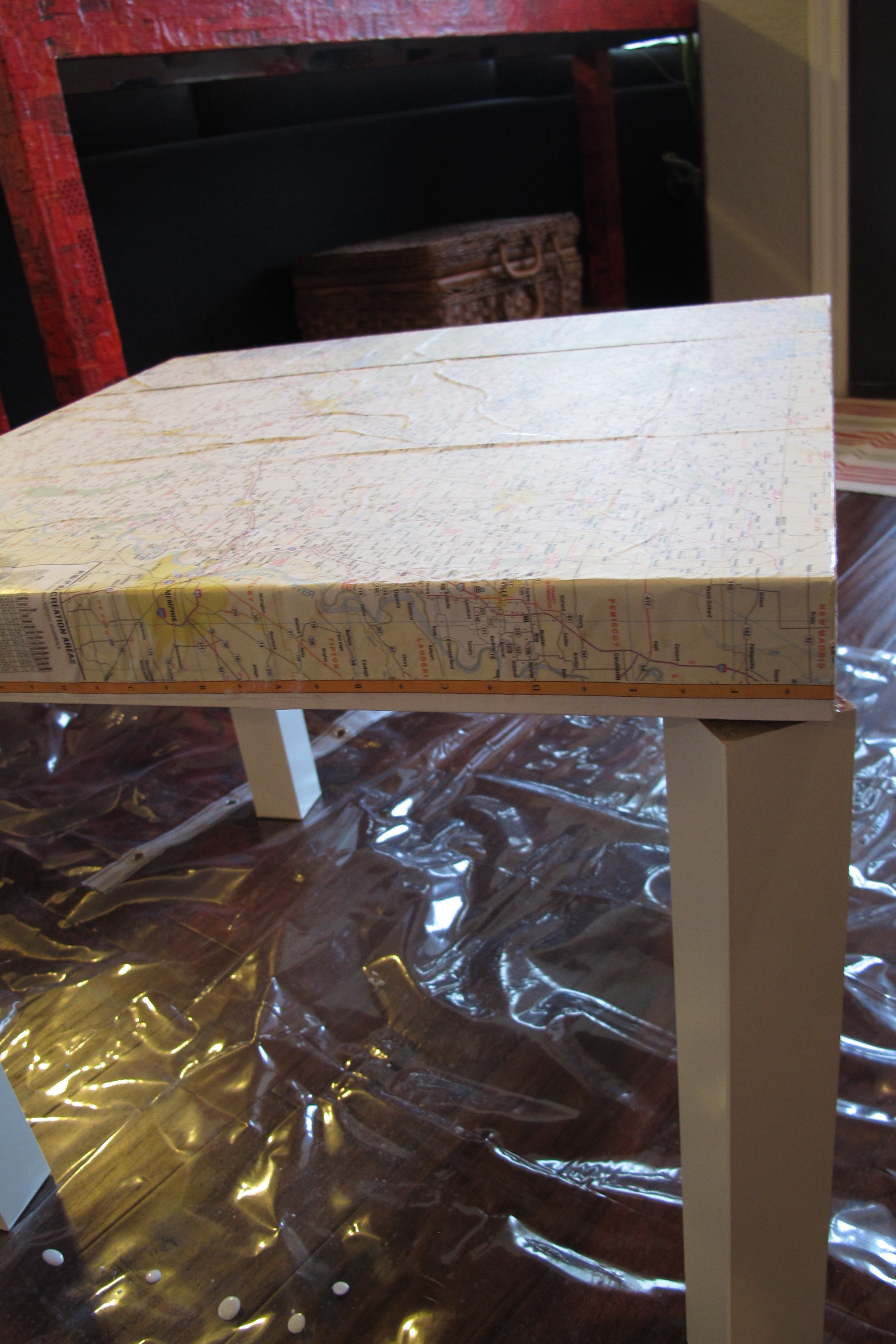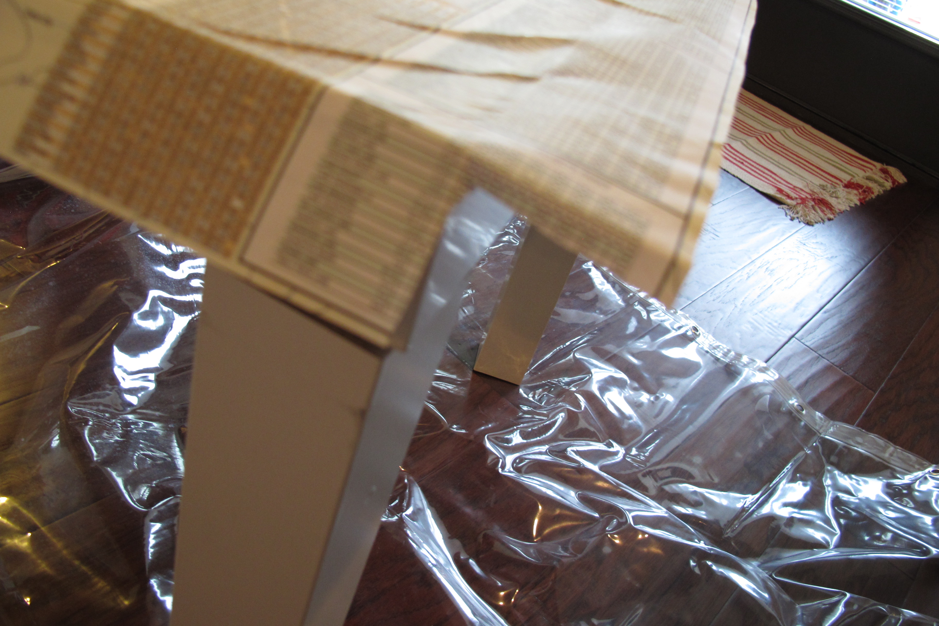 Anyways, updating the art took very little time and zero dollars. I just used what I had on hand. I simply taped off the frame and then Lucas and I painted over the canvas with white primer (It was Kilz Premium). Once that was dry, I taped off the canvas and stained the wooden frame using two coats of Varathane’s Early American stain. I then decoupaged a print that I already owned in the middle of the canvas with Matte Mod Podge (after cutting it down to size using my sweet neighbor’s paper slicer (have I mentioned that I love our neighbors?)). I’ve found that the key to Mod Podging paper is to “glue” the paper down with one coat of Mod Podge, then let it dry thoroughly before adding coats over top. This prevents the paper from sliding and tearing.