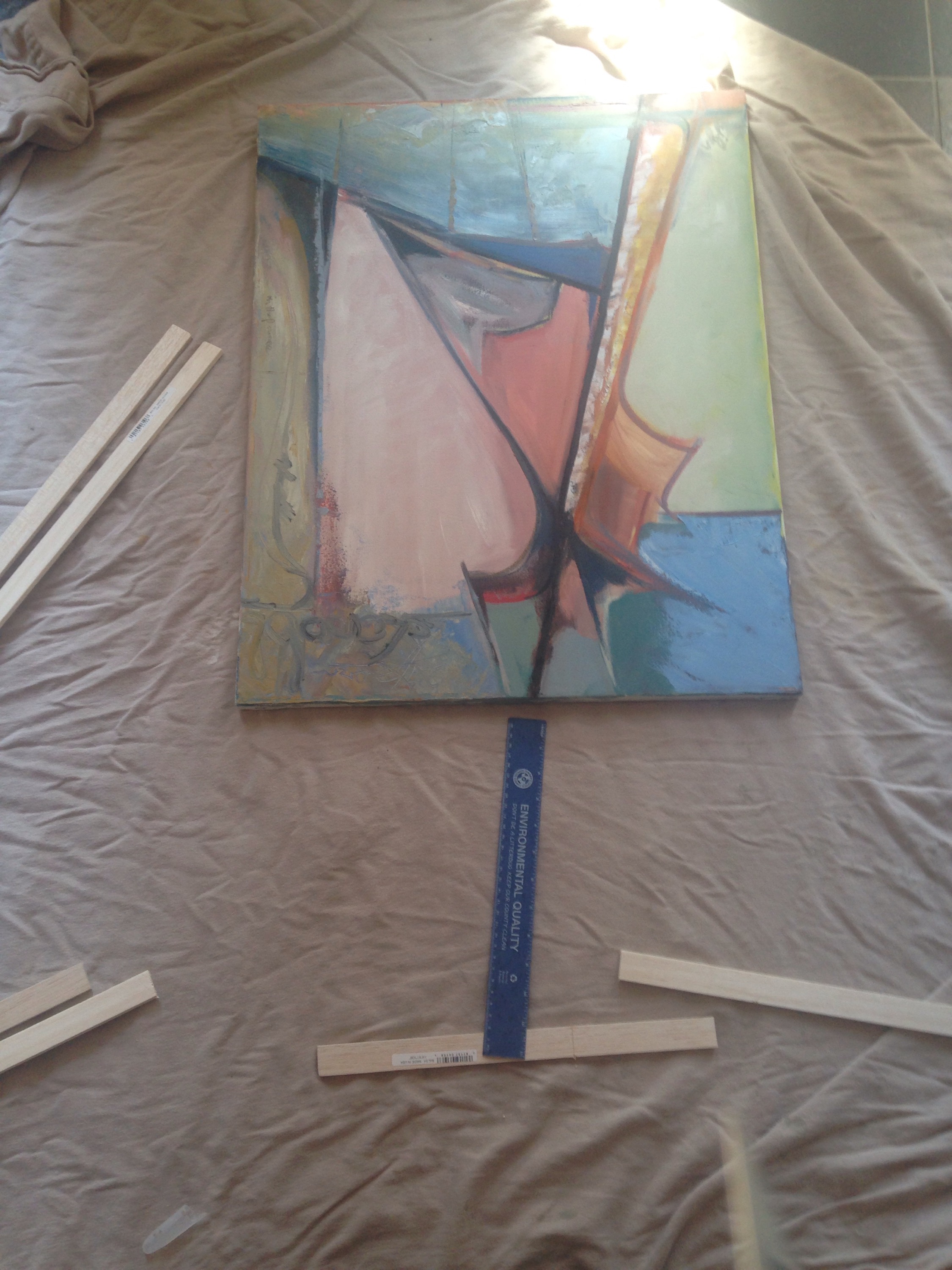 Anyways, I chose to use four pieces of 1″ x 1/4″ x 36″ balsa wood, which I purchased from Joanne’s. Then, I simply measured my canvas and cut my balsa wood to size using the straight edge of my ruler as a guide. I made multiple passes of the knife until I cut entirely through the wood…