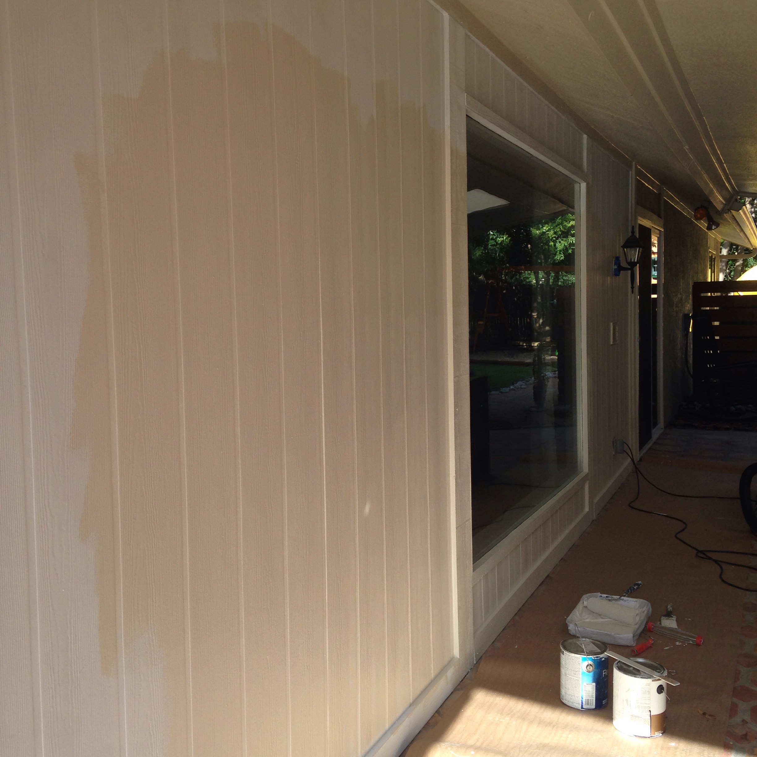 The following day, I set about painting. Luckily, our painter had left us a bunch of paint from when we had the exterior of the house painted. It was Sherwin Williams Resilience in Loggia mixed at 25%. Having learned my lesson with the roller cover the day before, I chose the puffiest roller I had which was meant for rough surfaces. I rolled on a small section…