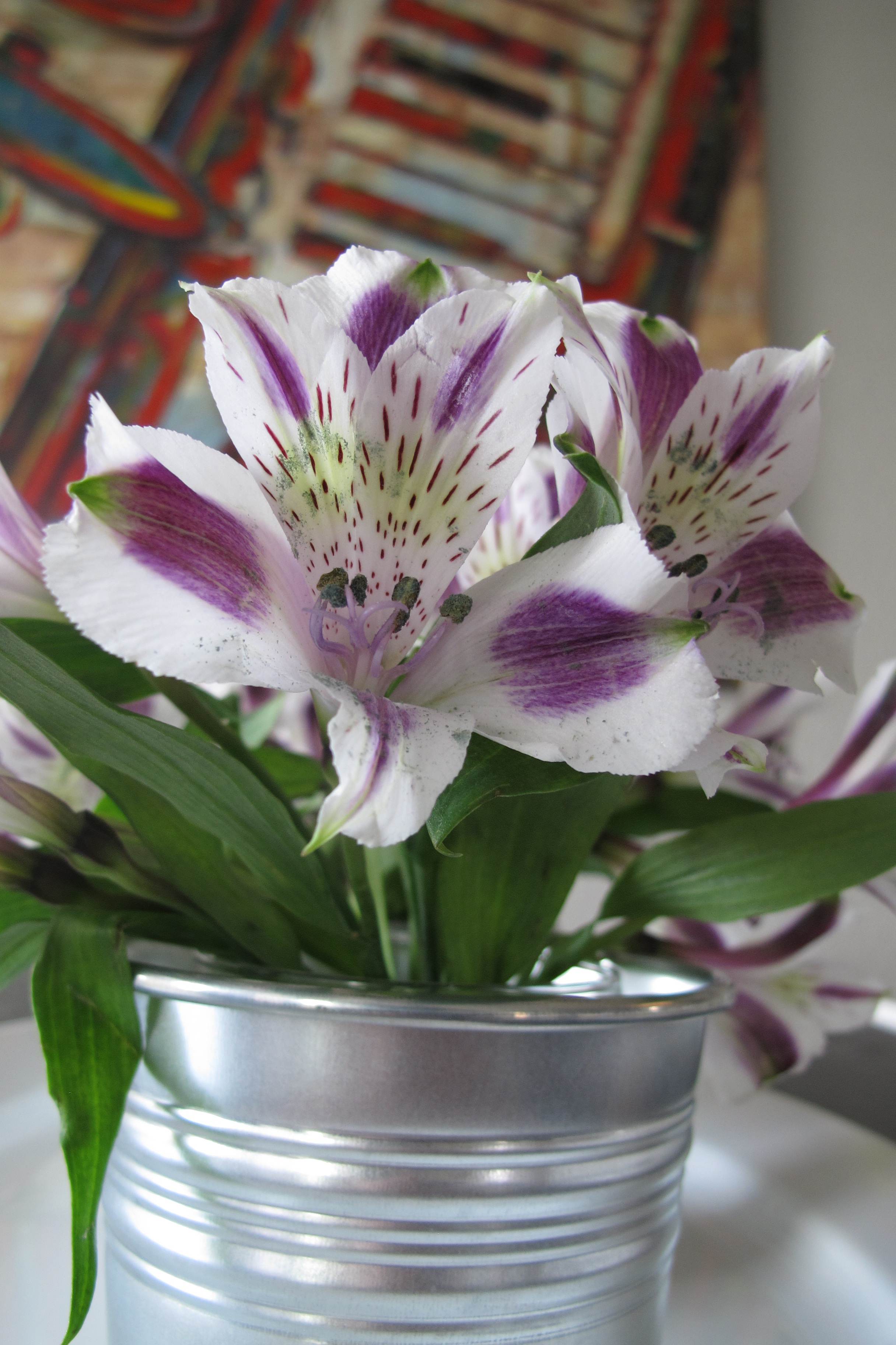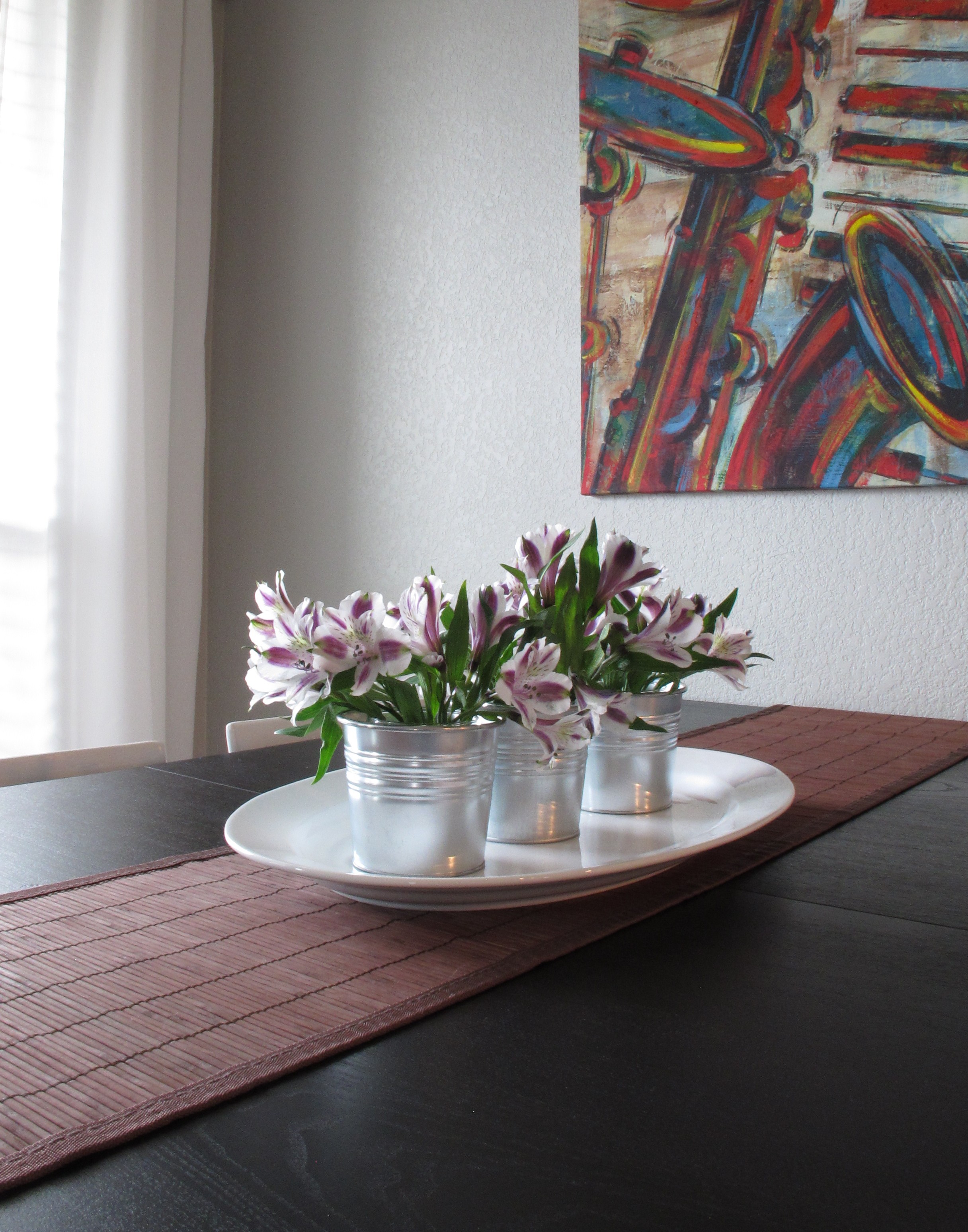 As for the flowers, he gave me a large bouquet of purple and pink lilies. Gorgeous. He always picks good ones, I’ll tell ya. I decided that a centerpiece change-up was well overdue, so I grabbed some galvanized buckets that I had laying around the house, a white platter from the kitchen, and a bamboo table runner…