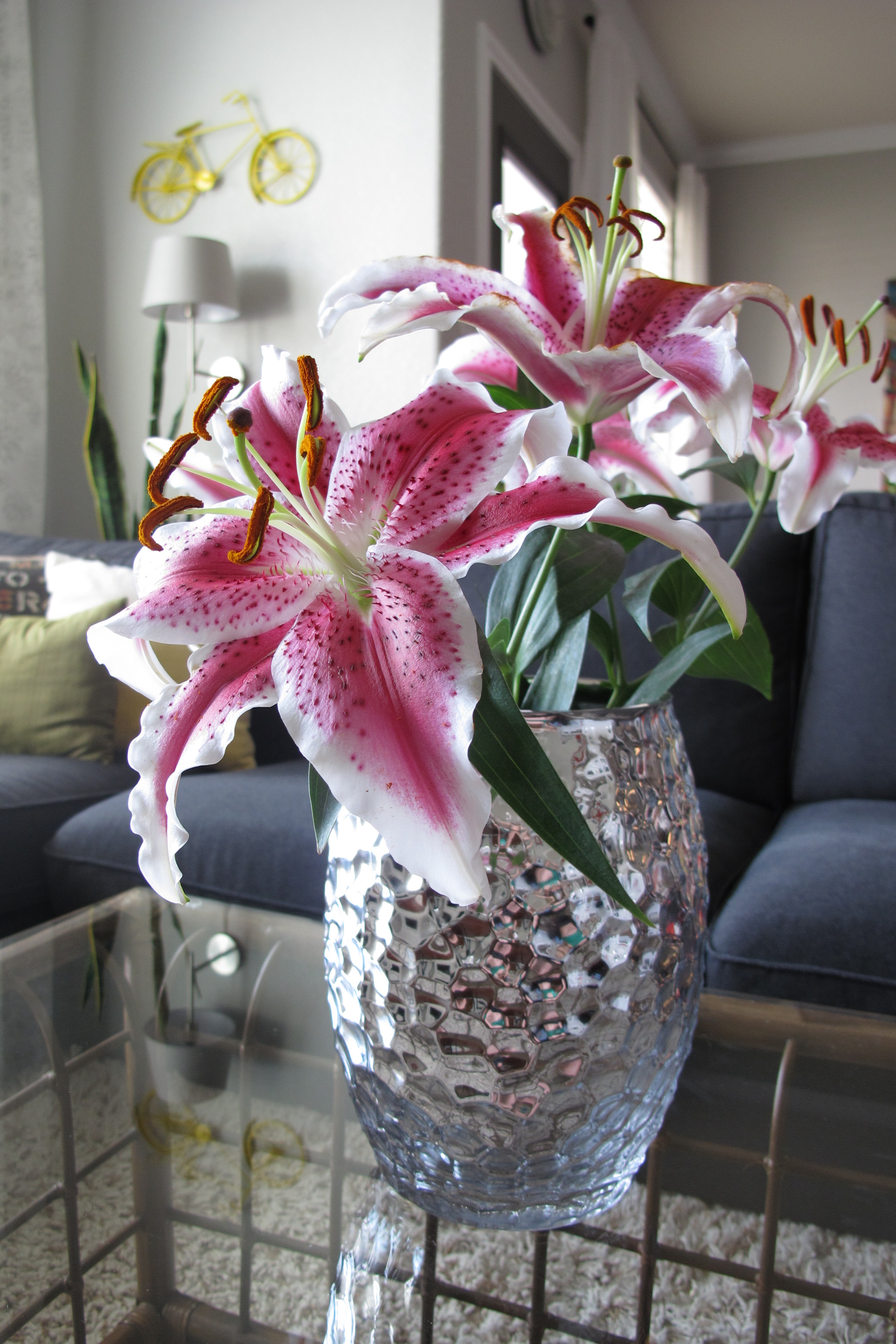 I love the blingy, glittery vase in contrast with our rattan coffee table. It just happys up the living room to no end. Now, if only I could keep the arrangement here all the time… Unfortunately, having a three-year-old requires glamorous flowers to be relocated to the kitchen island after picture-taking time. Just keepin’ it real, here. I will say that I enjoyed their eye-candy-producing time on the coffee table, no matter how short the period. So, that’s my newest adventure in flower fun. I hope everyone has a great weekend!!